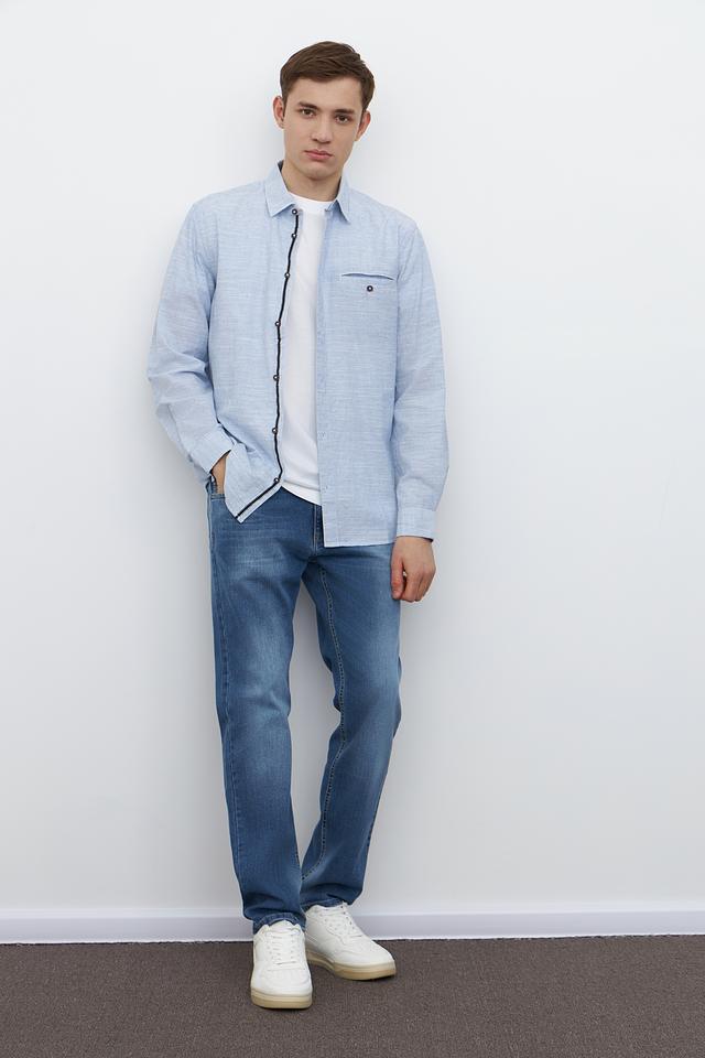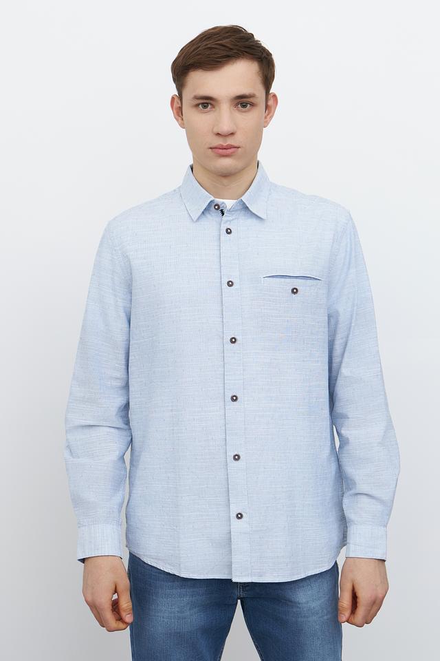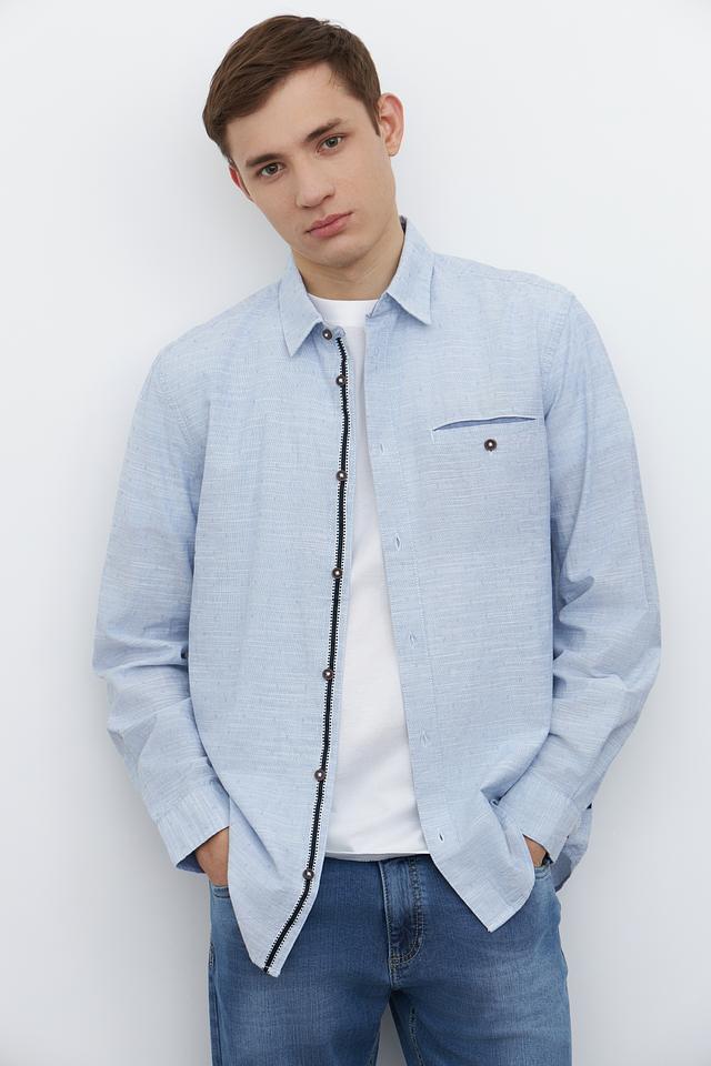 Рубашка имеет классический крой, который подходит для различных типов фигур. Воротник и планка с пуговицами выполнены в контрастном тёмно-синем цвете, что добавляет стильный акцент. На груди расположена накладная деталь – карман, который придает рубашке функциональность и интересный вид.