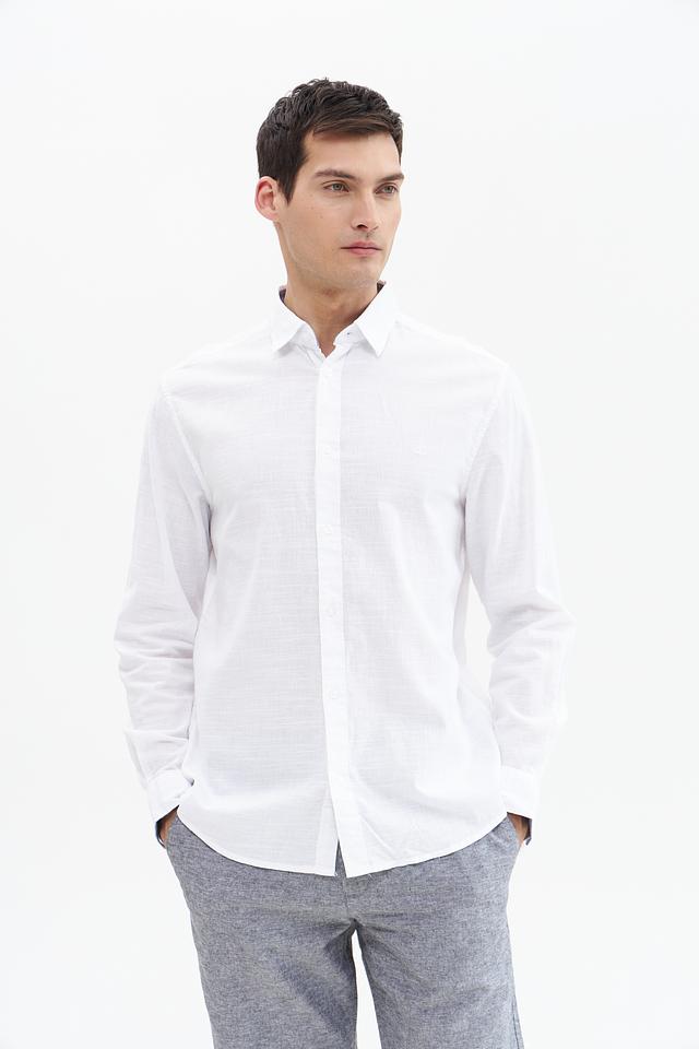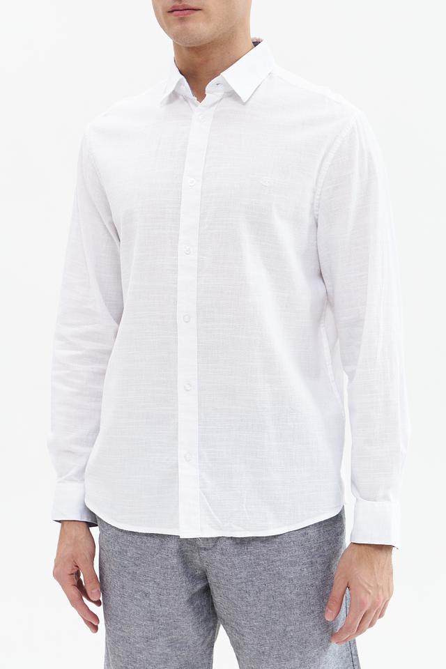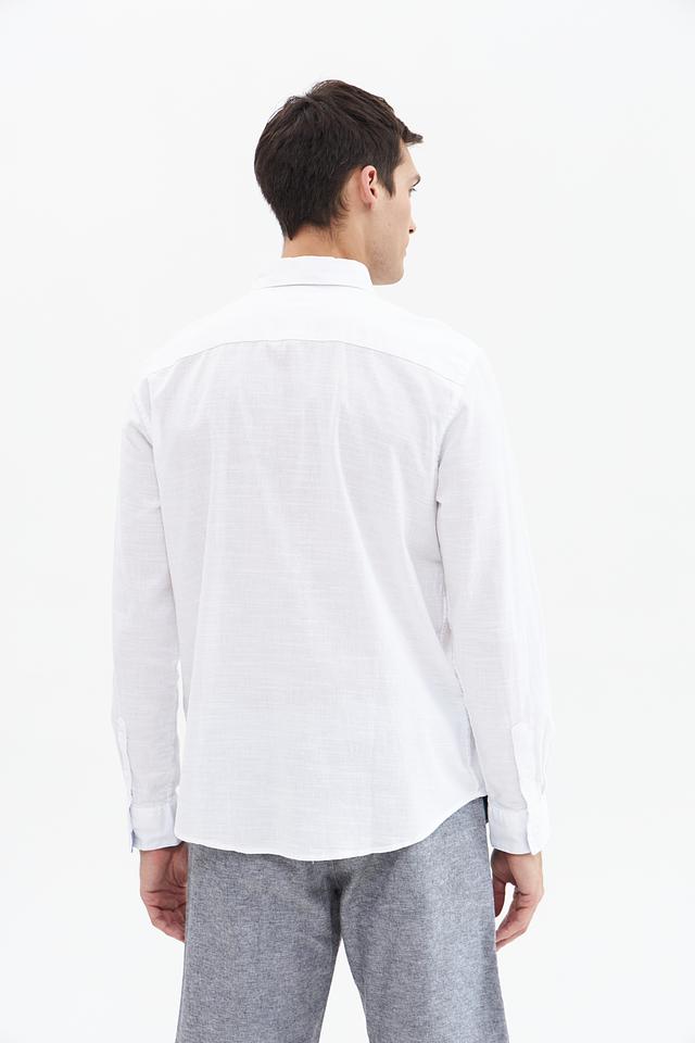 Рубашка имеет стандартную посадку, воротник классической формы и застёжку на пуговицы. Текстура ткани придает рубашке лёгкую небрежность и стильный вид. Белый цвет делает эту рубашку универсальной и легко сочетаемой с другими элементами одежды.