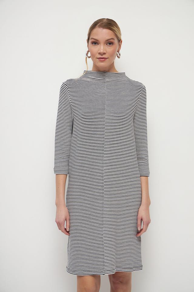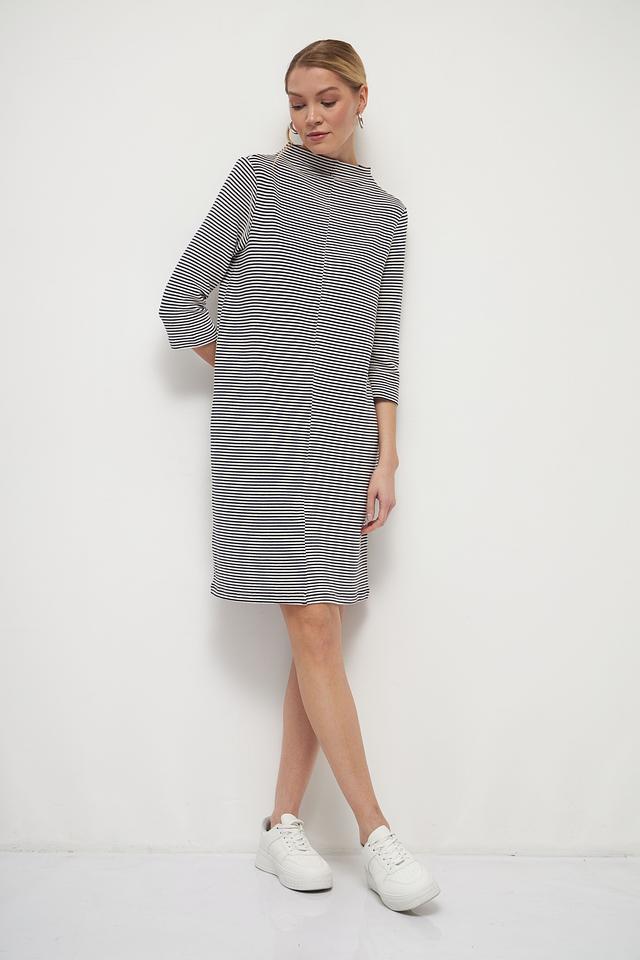Платье имеет прямой силуэт, короткий рукав 3/4 и округлый вырез горловины. Ткань мягкая и приятная к телу, благодаря составу, включающему хлопок, полиэстер, вискозу и эластан.