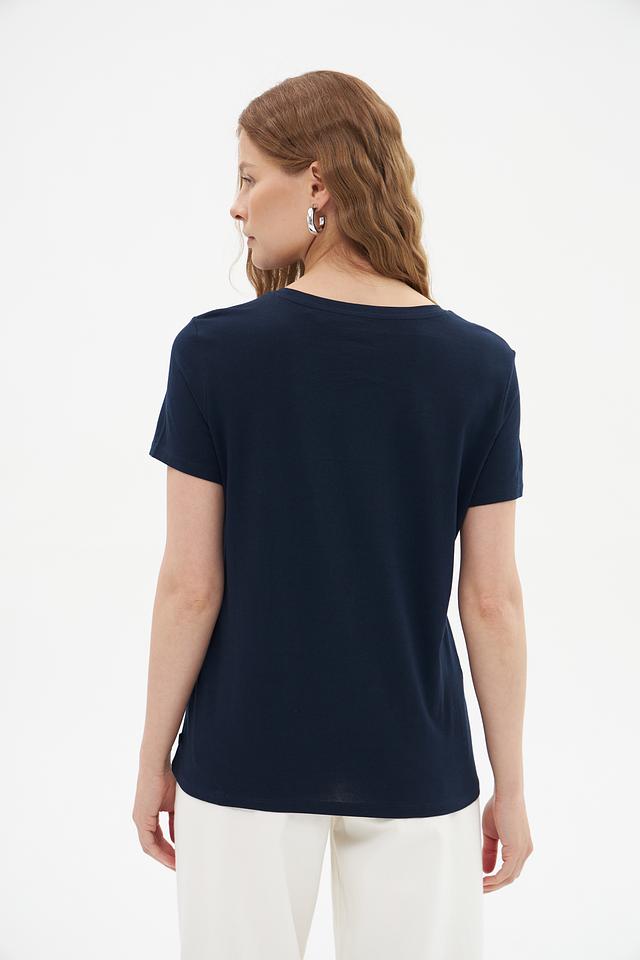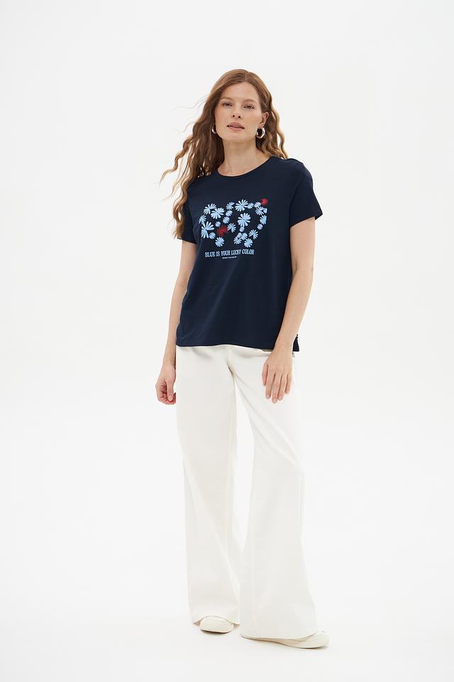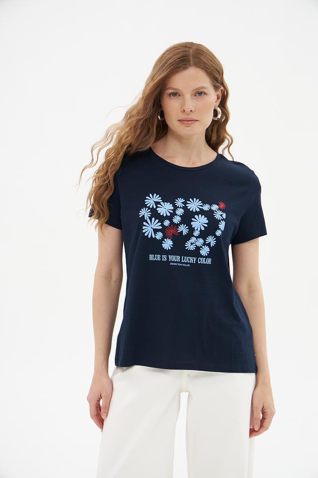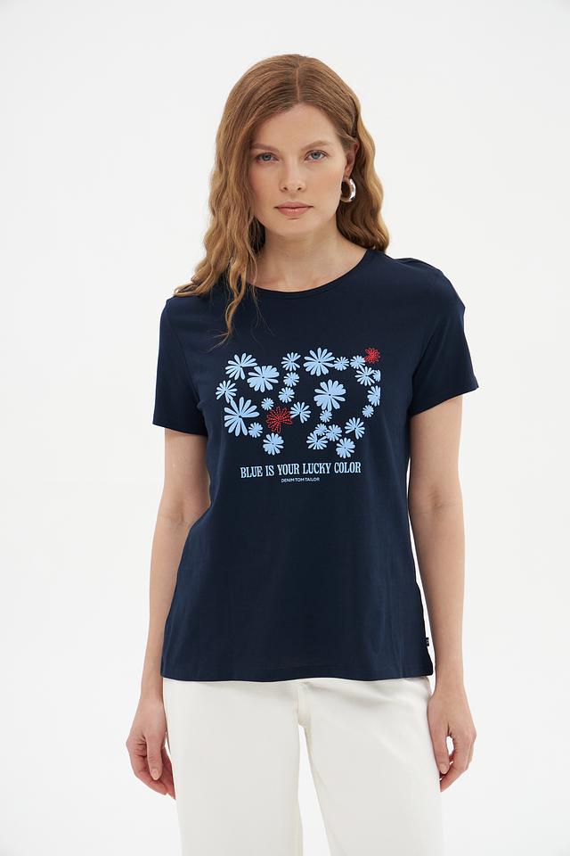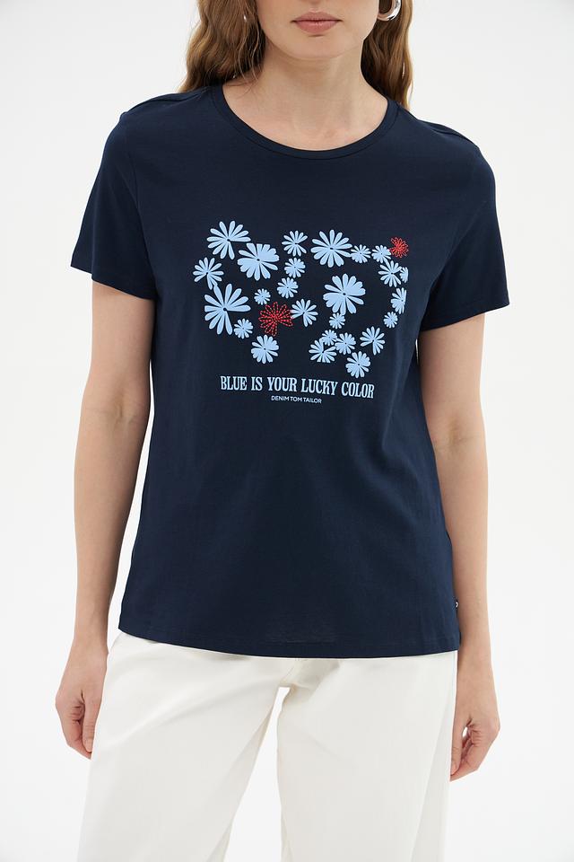 Женская футболка Tom Tailor denim темно-синего цвета, украшена цветочным принтом и надписью "Blue is your lucky color". Изготовлена из 100% хлопка, обеспечивая комфорт и воздухопроницаемость. Состав: хлопок 100%