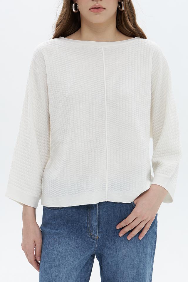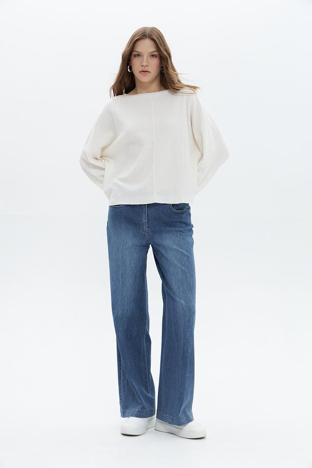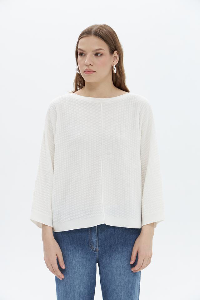 Пуловер имеет свободный крой и округлый вырез горловины, что обеспечивает максимальный комфорт при носке. Текстурная вязка добавляет изделию объём и оригинальность.