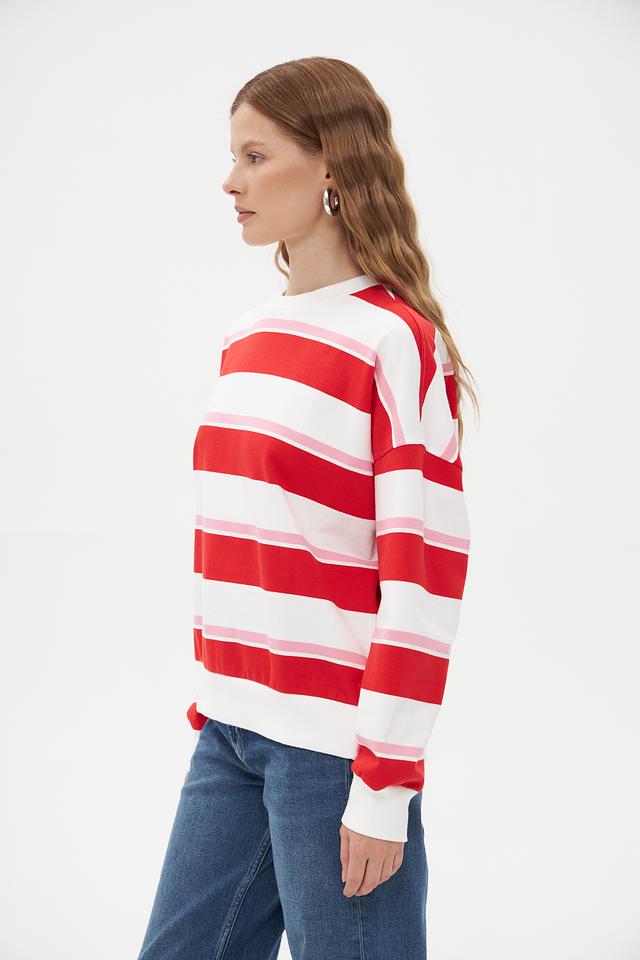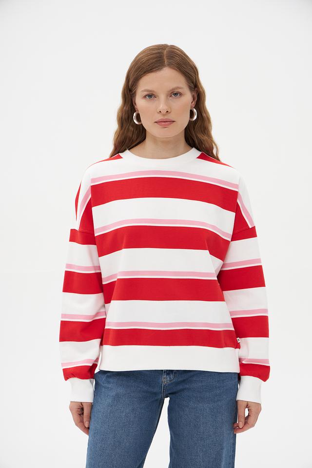 Женский пуловер Tom Tailor красного цвета с ярким полосатым дизайном. Изготовлен из мягкого хлопка, обеспечивающего комфорт в носке. Стильное и удобное решение для повседневного гардероба. Состав: хлопок 100%