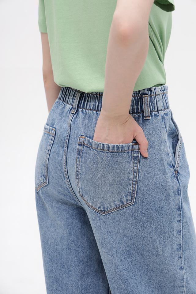 Модель имеет завышенную талию и эластичный пояс, обеспечивающие удобную посадку по фигуре. Джинсы выполнены в светло-голубом цвете с эффектом потертости и вареного денима, что придает им непринужденный и модный вид. Пять карманов – два спереди и два сзади – добавляют функциональности.