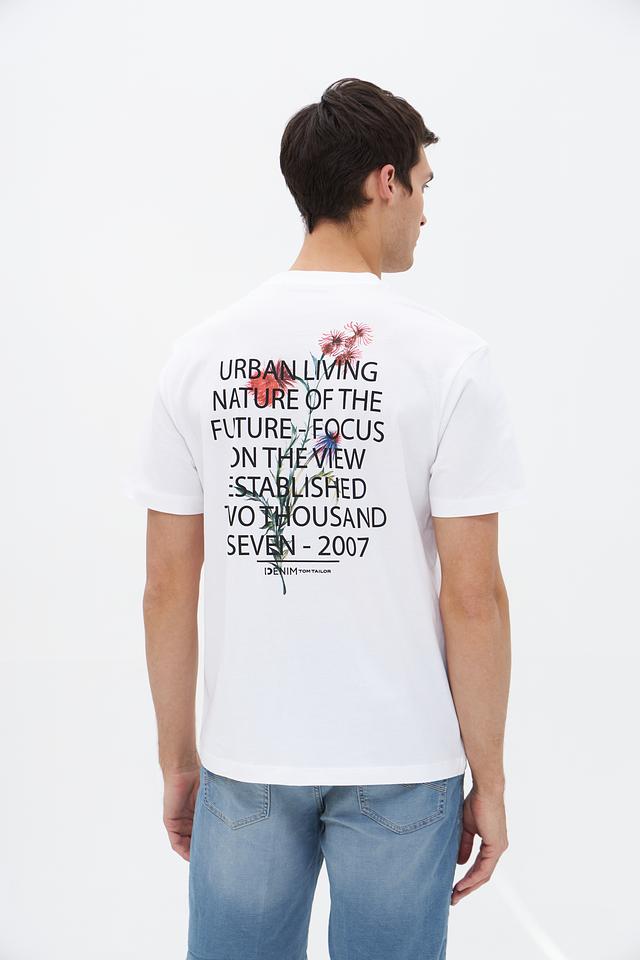Футболка имеет классический прямой крой, который подходит для любого типа фигуры. На груди расположен небольшой принт с логотипом бренда и надписью "DENIM", а на спине – более крупный графический принт с надписями и изображением цветка.