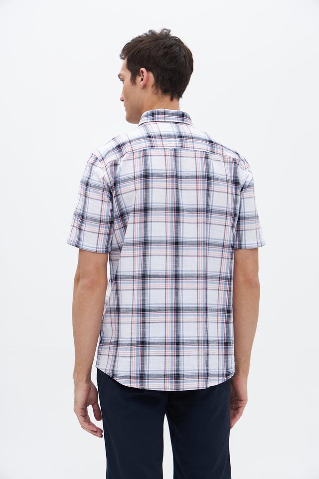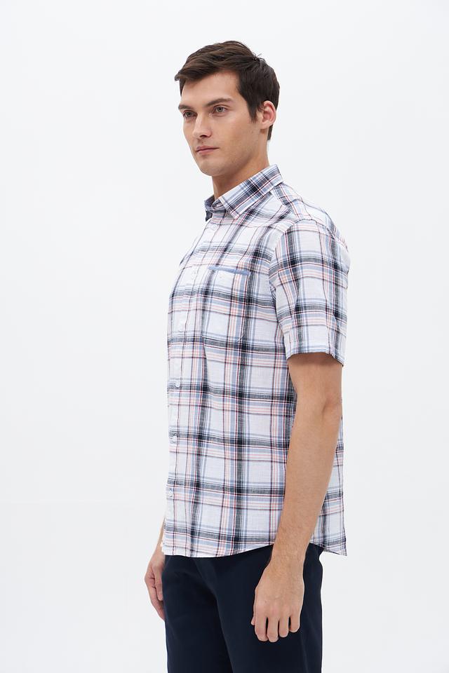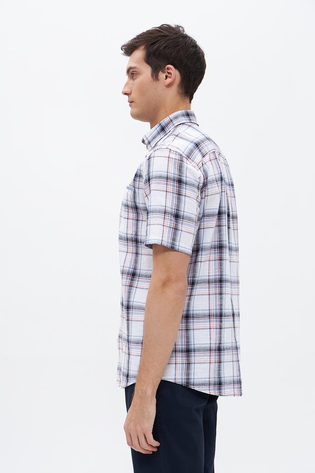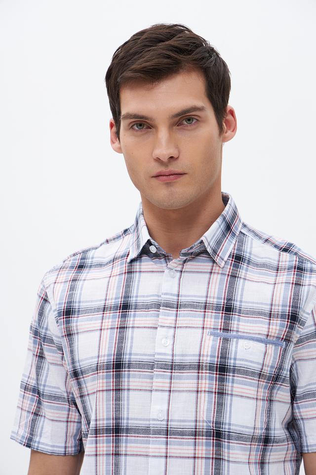 Основной цвет рубашки – белый, но благодаря клетчатому рисунку в синих, красных и серых тонах, она выглядит динамично и интересно. Рисунок клетки придает рубашке универсальность, позволяя сочетать ее с различными брюками и шортами.