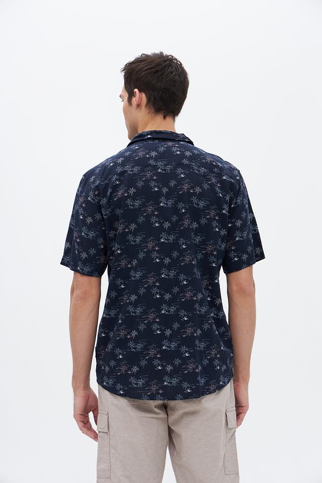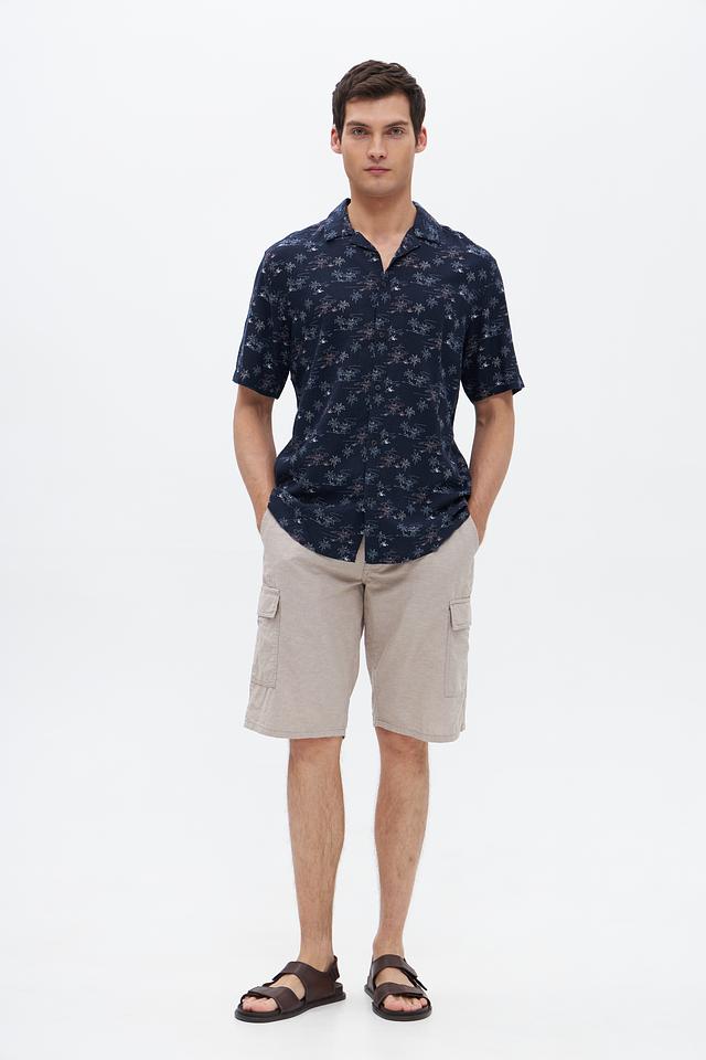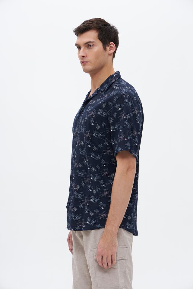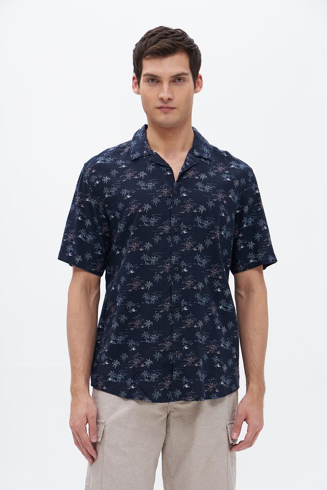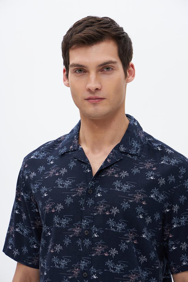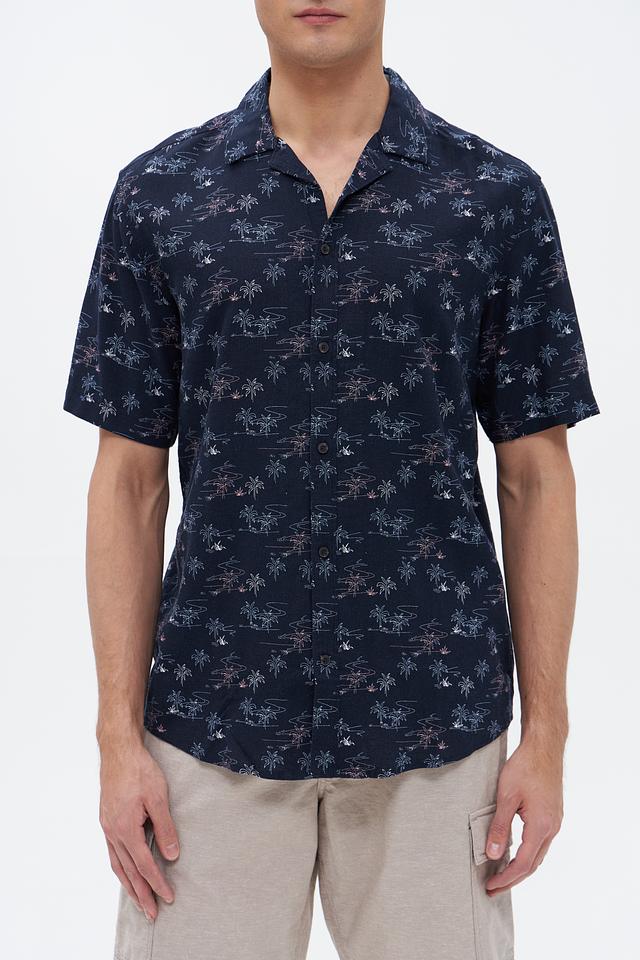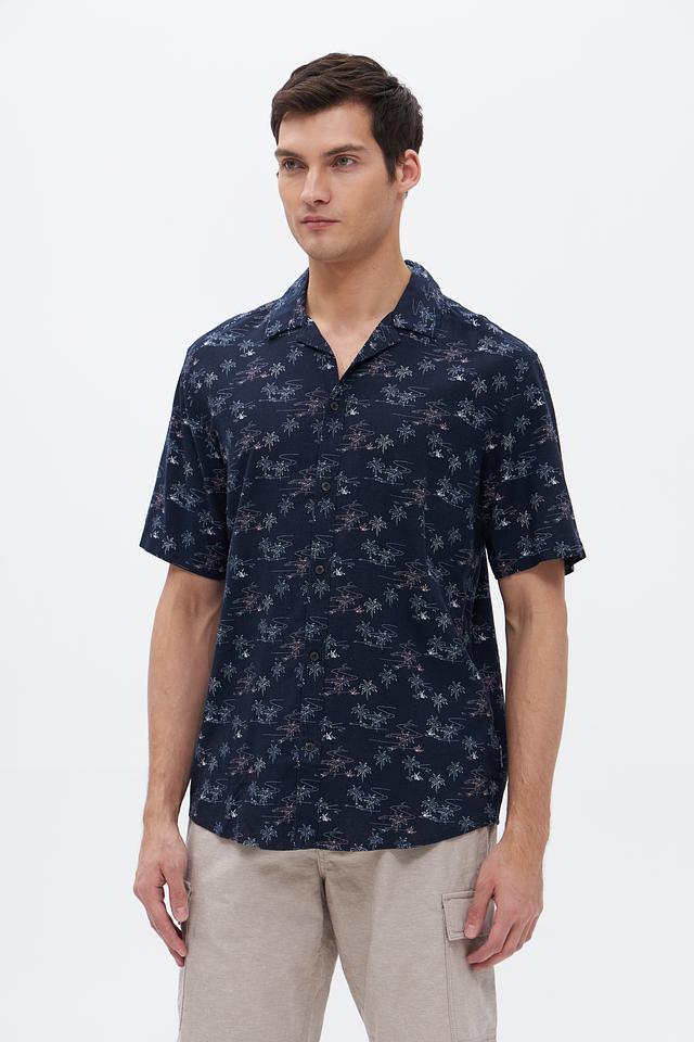 Мужская рубашка Tom Tailor темно-синего цвета с коротким рукавом и ярким тропическим принтом. Изготовлена из мягкой и приятной к телу ткани, идеально подходит для летнего гардероба. Состав: вискоза 73%, лен 27%