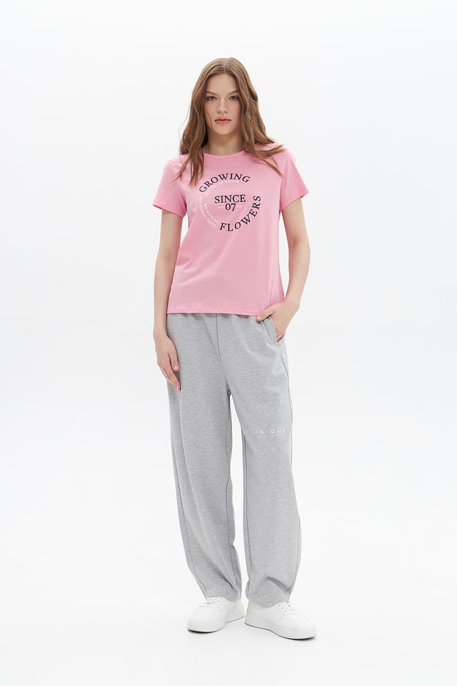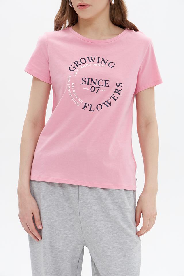 Футболка имеет классический крой с круглым вырезом горловины и короткими рукавами. На передней части расположен яркий принт с надписью "GROWING FLOWERS SINCE 07", который добавляет образу оригинальности и стиля.