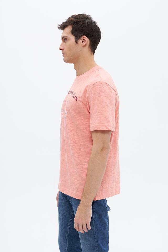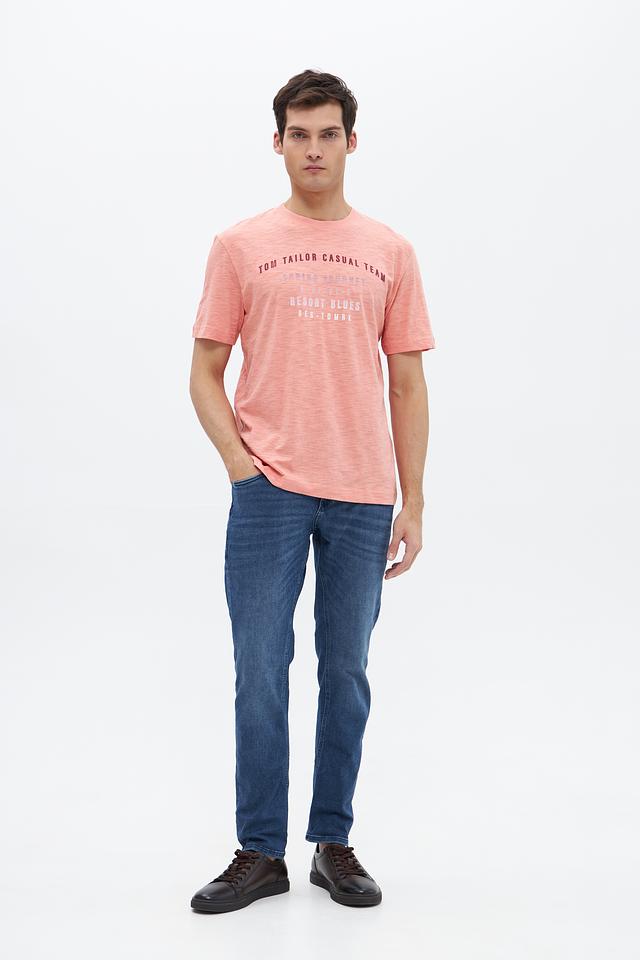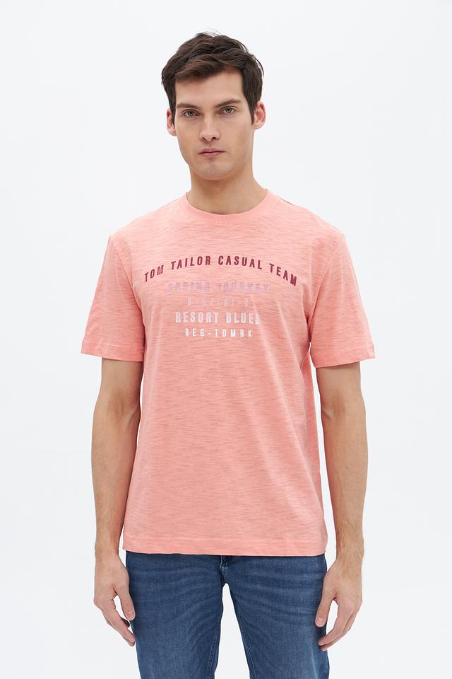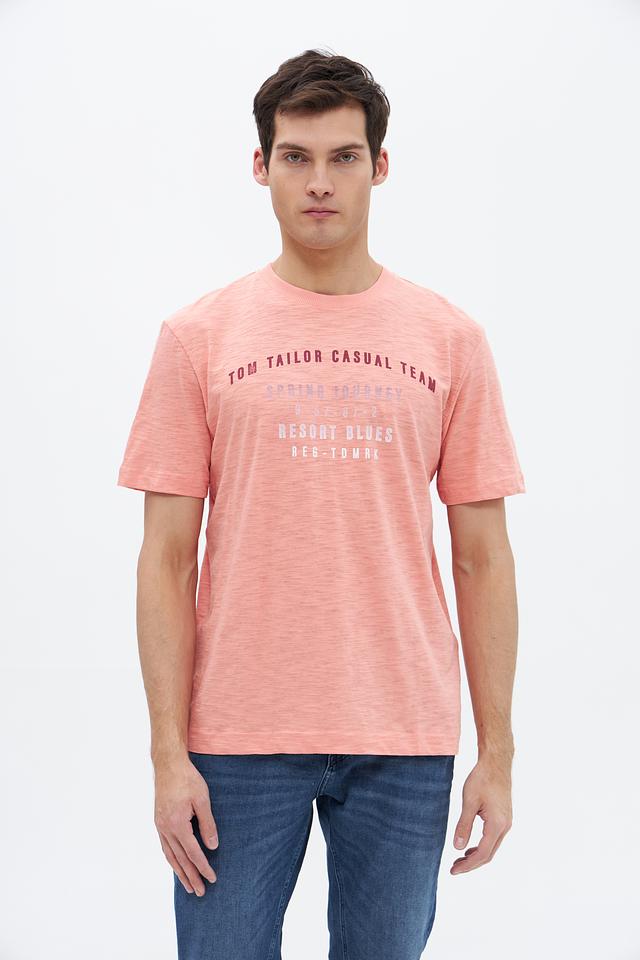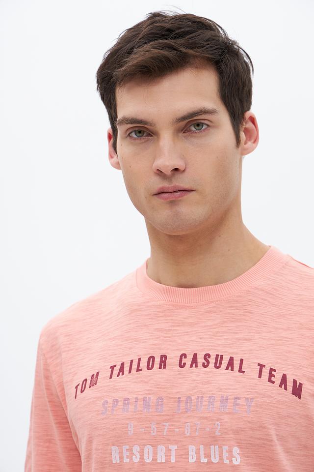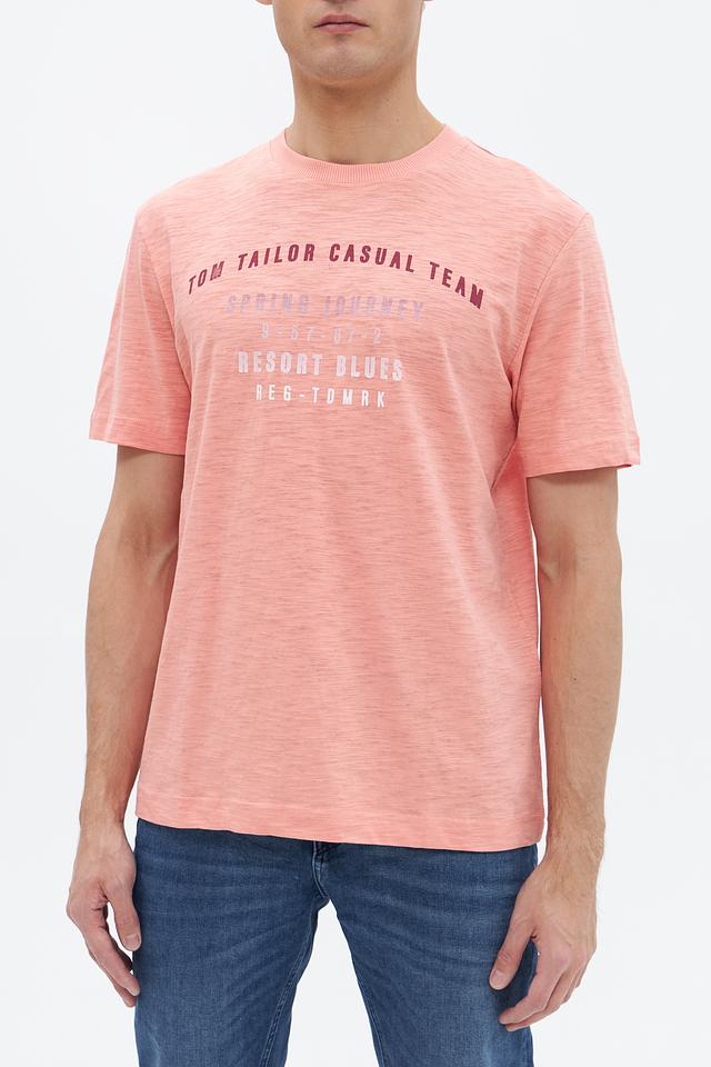 Мужская футболка Tom Tailor персикового цвета с оригинальным принтом. Изготовлена из 100% хлопка, обеспечивающего комфорт и воздухопроницаемость. Состав: хлопок 100%