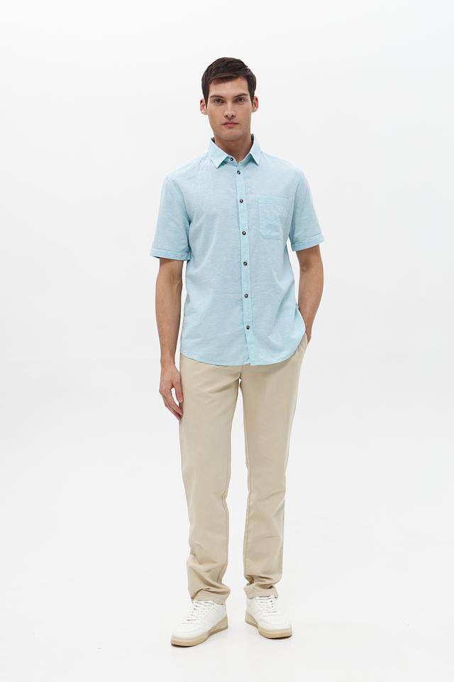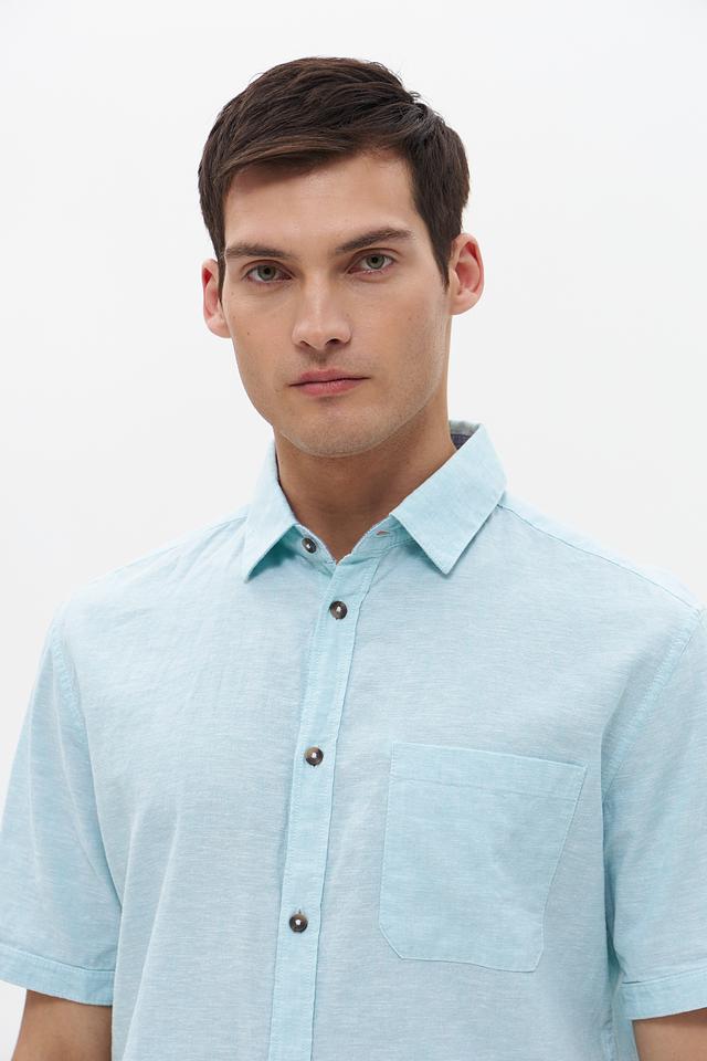 Рубашка имеет классический крой с короткими рукавами и стандартным воротником. Мятный цвет придает образу свежесть и легкость, а однотонный дизайн позволяет сочетать рубашку с различными брюками и шортами.