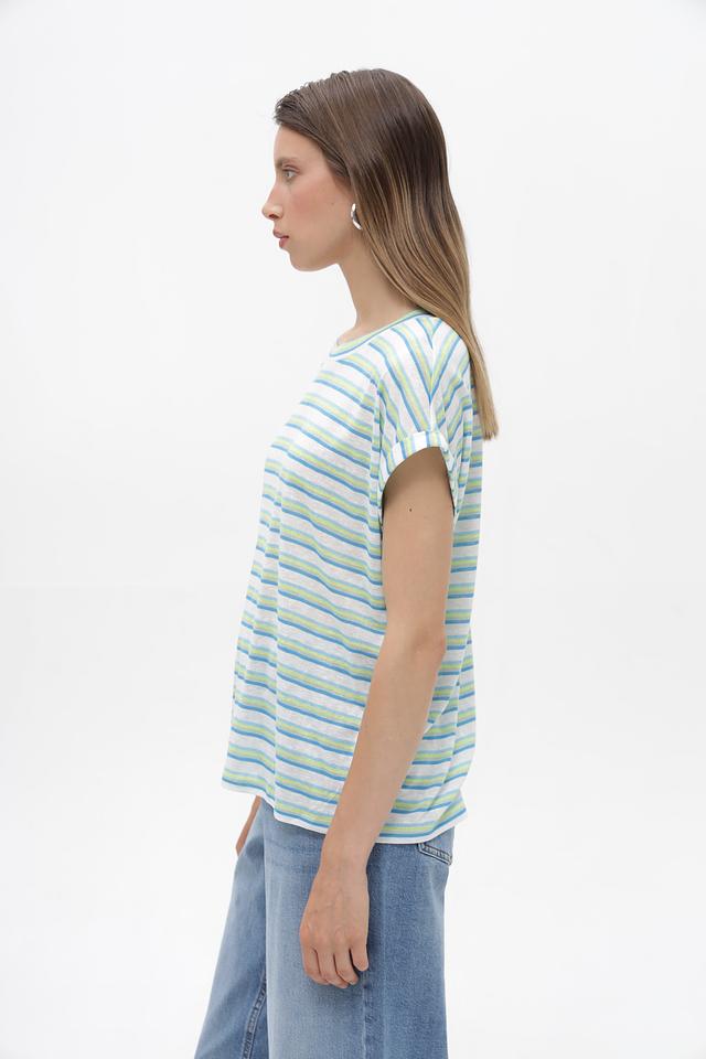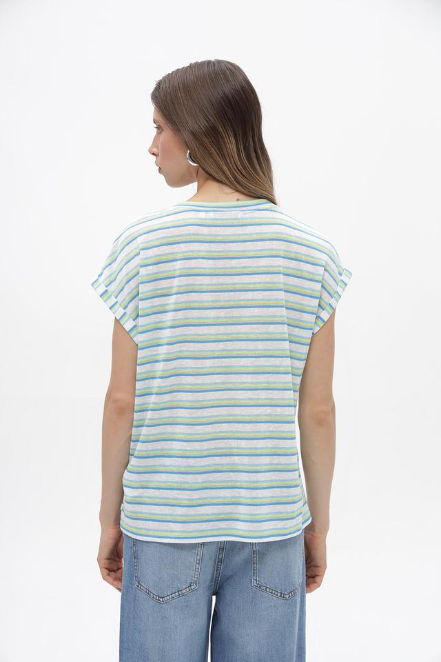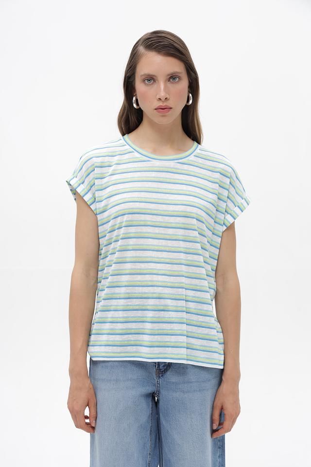 Эта стильная футболка от Tom Tailor станет отличным дополнением к вашему гардеробу. Модель выполнена в горизонтальную полоску, сочетающую в себе оттенки зелёного, голубого и белого.