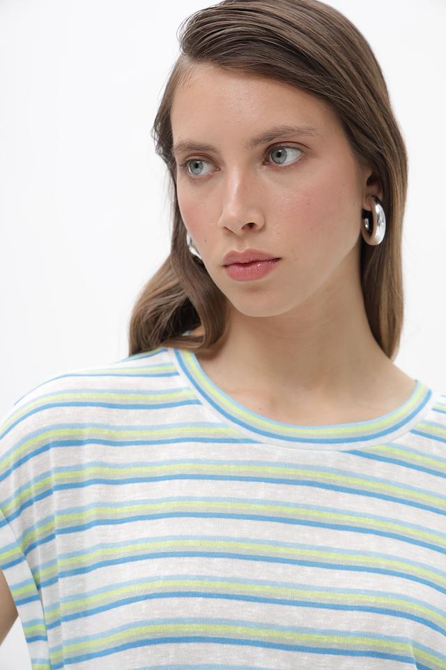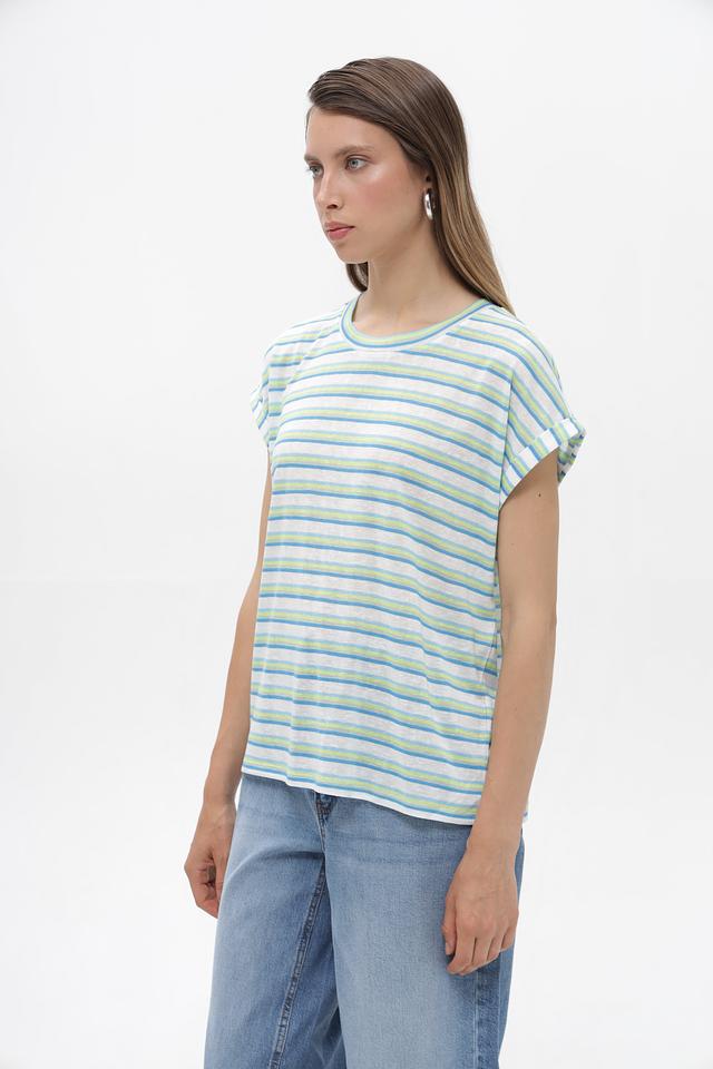 Футболка имеет прямой крой, короткие рукава с небольшим отворотом и круглый вырез горловины. Изготовлена из приятной к телу ткани, состоящей из 70% вискозы и 30% полиэстера, что обеспечивает комфорт и легкость в носке.
