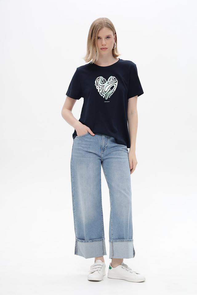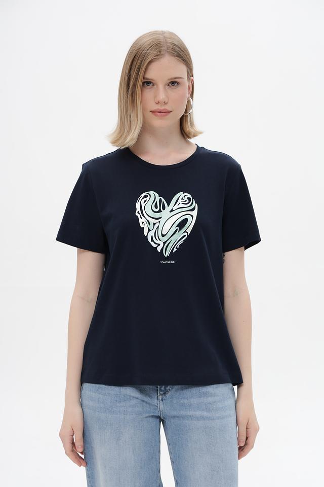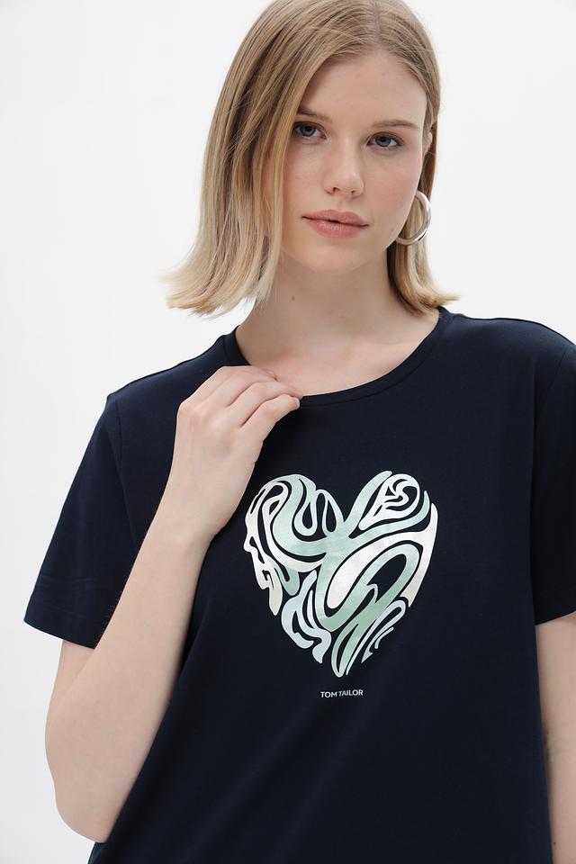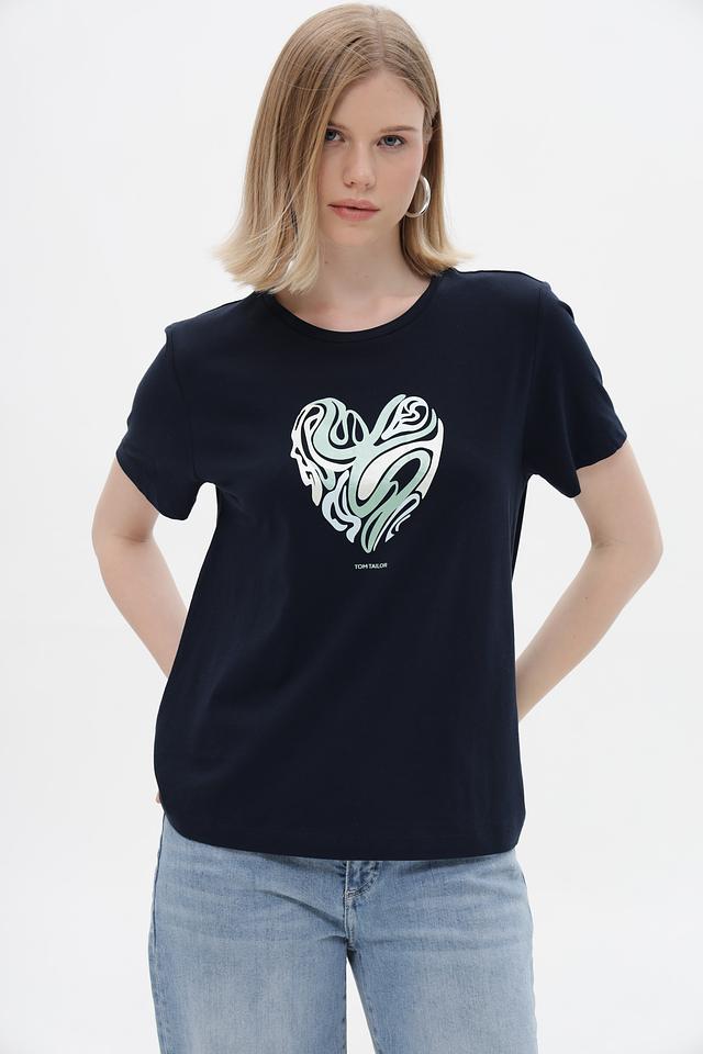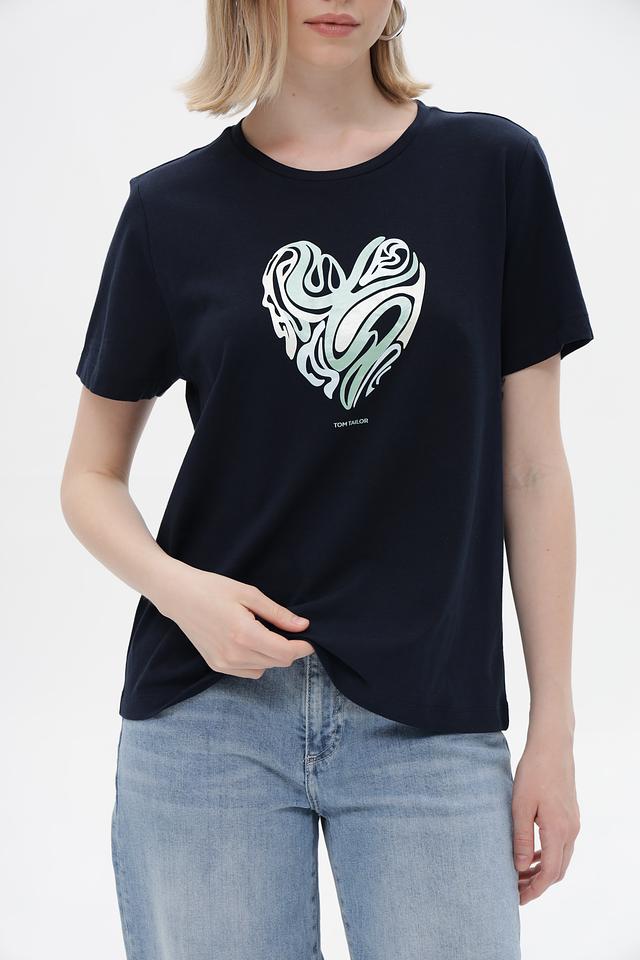 Чёрная футболка Tom Tailor с оригинальным принтом в виде сердца. Изготовлена из 100% хлопка, обеспечивающего комфорт и воздухопроницаемость. Стильный и удобный вариант для повседневного образа. Состав: хлопок 100%