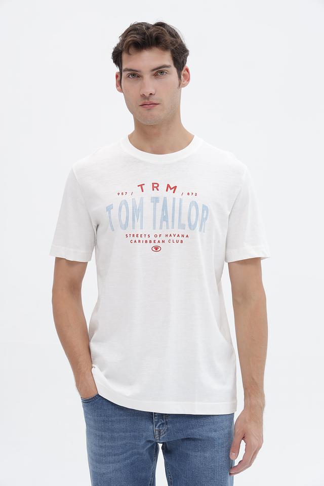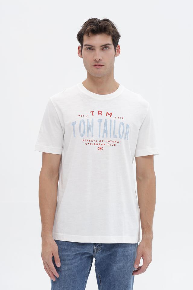 Белая футболка Tom Tailor с ярким принтом "Streets of Havana". Изготовлена из 100% хлопка, обеспечивая комфорт и воздухопроницаемость. Отличный выбор для повседневного образа. Состав: хлопок 100%