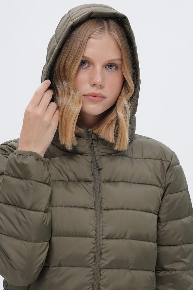 Пальто имеет стеганую структуру, капюшон и застегивается на молнию по всей длине. Два боковых кармана обеспечивают удобство хранения мелочей. Длина пальто – до середины бедра, что делает его подходящим для повседневной носки.