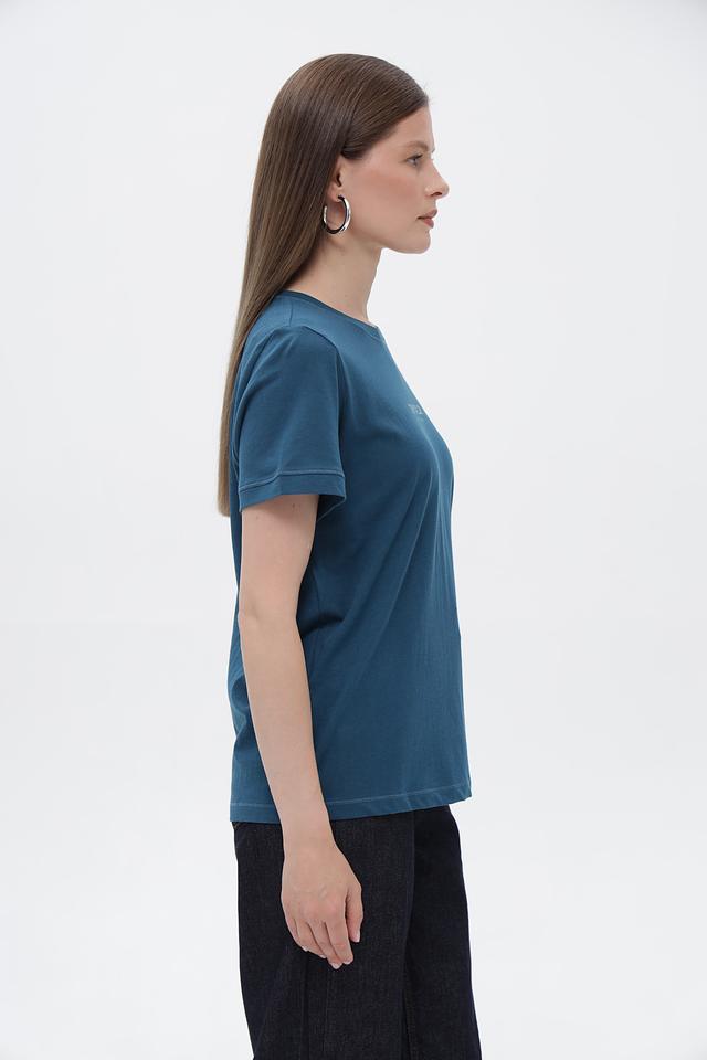 Футболка имеет прямой крой, который обеспечивает свободу движений, а короткие рукава делают ее идеальным выбором для теплой погоды. Бирюзовый цвет придает образу свежесть и легкость.