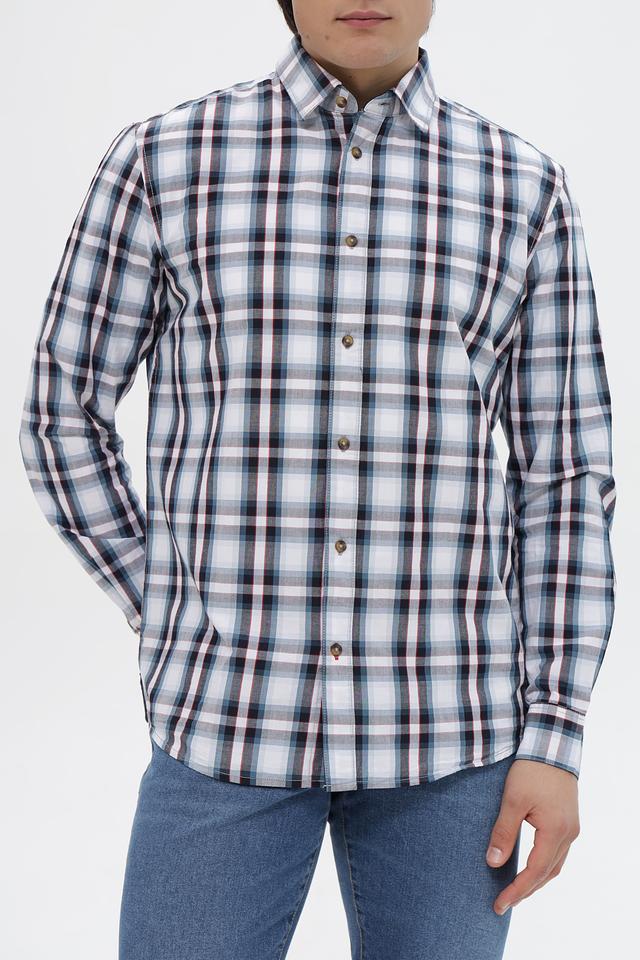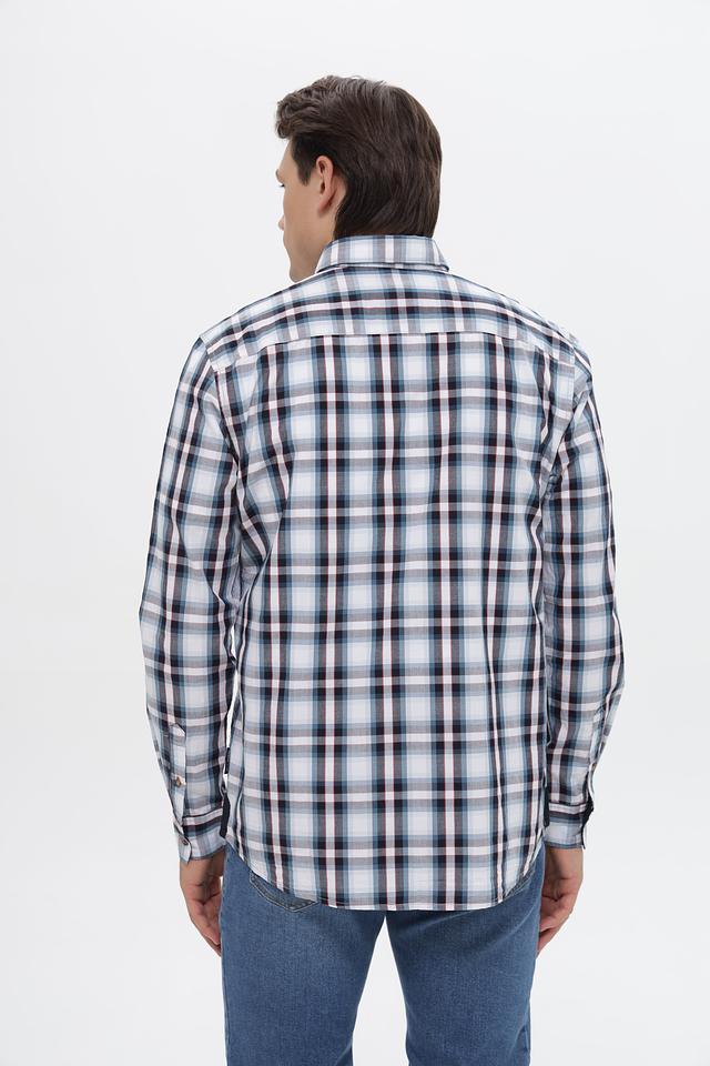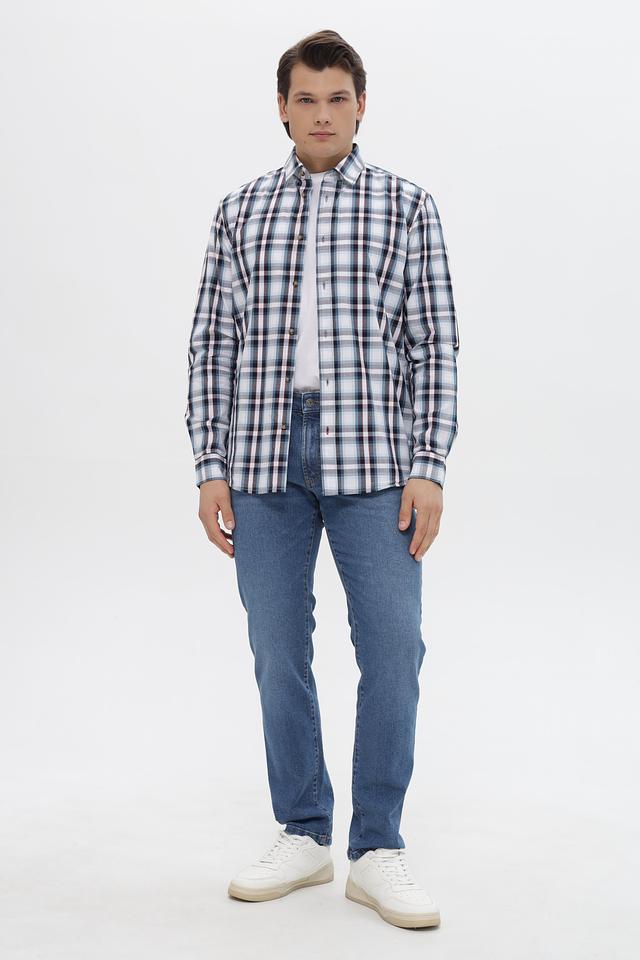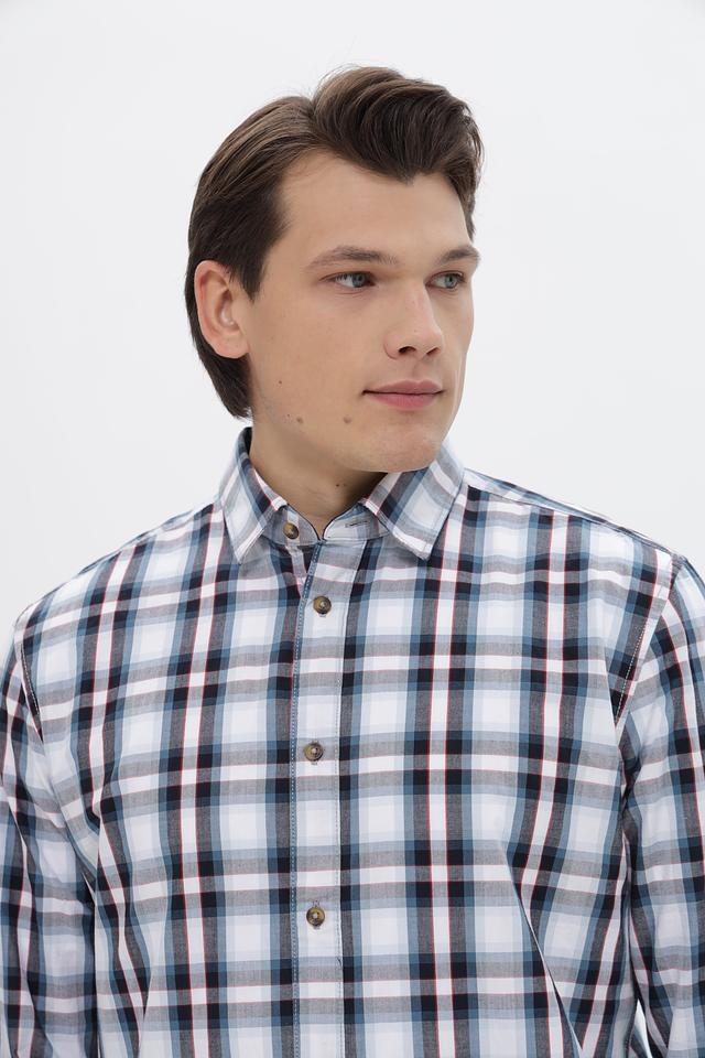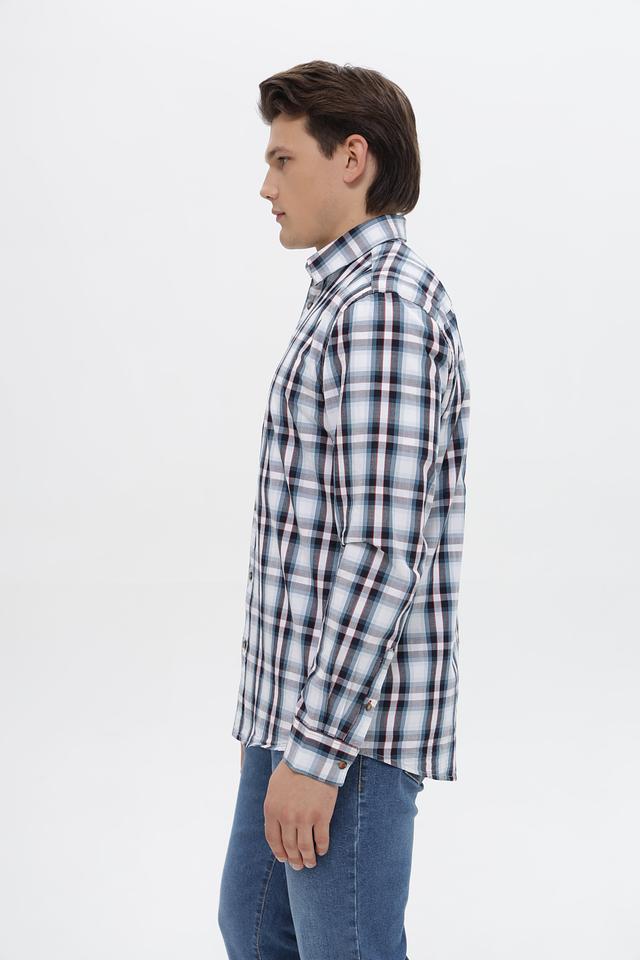 Цветовая гамма рубашки включает в себя сочетание синего, белого и бордового цветов, создавая стильный и современный образ. Рубашка имеет стандартную посадку, подходящую для большинства типов фигур. Застежка на пуговицах обеспечивает надежную фиксацию.