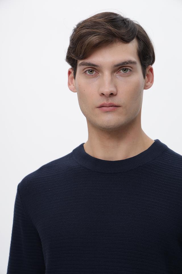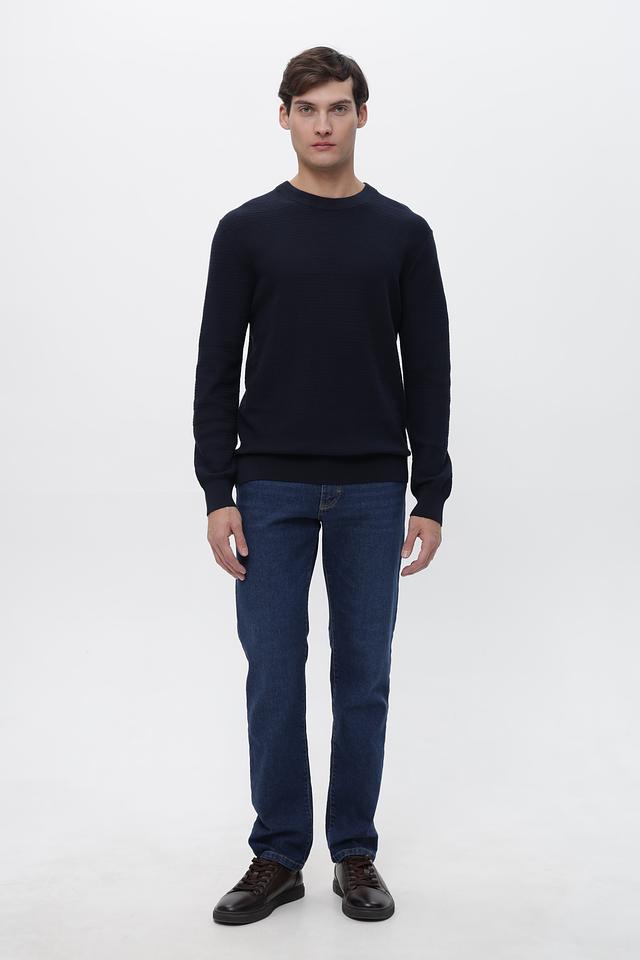 Модель имеет классический крой с круглым вырезом горловины и длинными рукавами. Тёмно-синий цвет делает джемпер универсальным и легко сочетаемым с различными элементами гардероба.