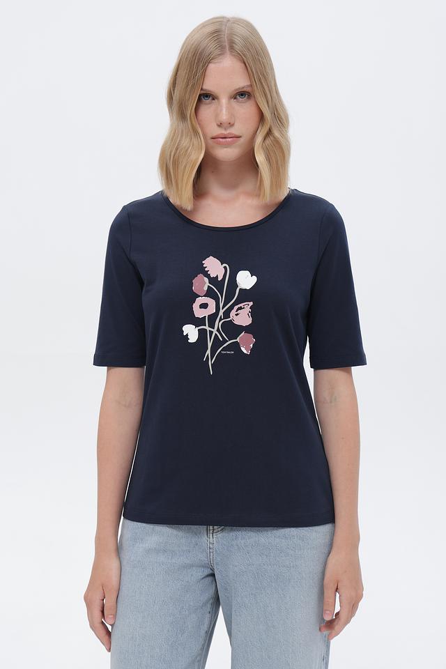 Женская футболка Tom Tailor темно-синего цвета с нежным цветочным принтом. Изготовлена из мягкого хлопка с добавлением эластана для комфорта и свободы движений. Стильный и удобный вариант для повседневного образа. Состав: хлопок 95%, эластан 5%