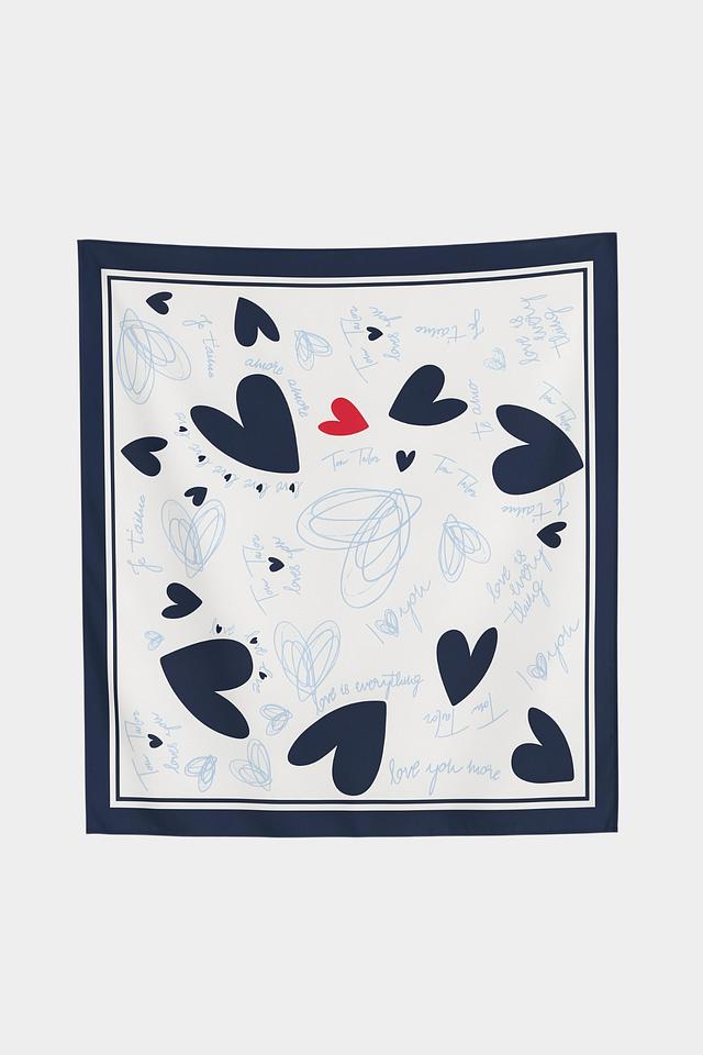 Шарф имеет квадратную форму и украшен ярким принтом, состоящим из сердец разных размеров и надписей. Основной цвет шарфа – синий, а рисунок выполнен в сочетании белого, красного и черного цветов.