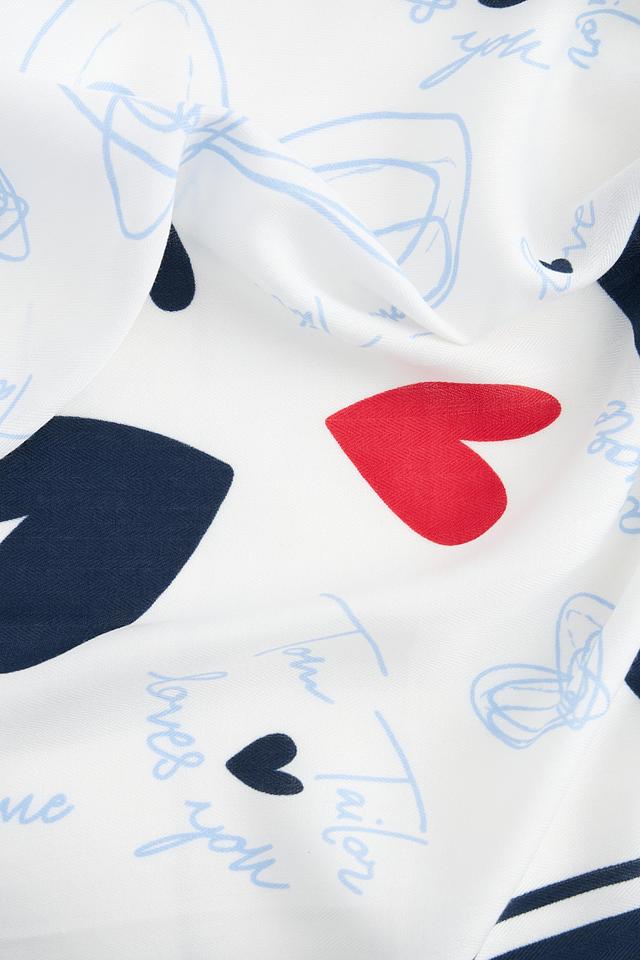 Шарф от Tom Tailor синего цвета с оригинальным принтом в виде сердец и надписей станет ярким акцентом вашего образа. Изготовлен из 100% полиэстера, что обеспечивает легкость и приятные тактильные ощущения. Состав: полиэстер 100%
