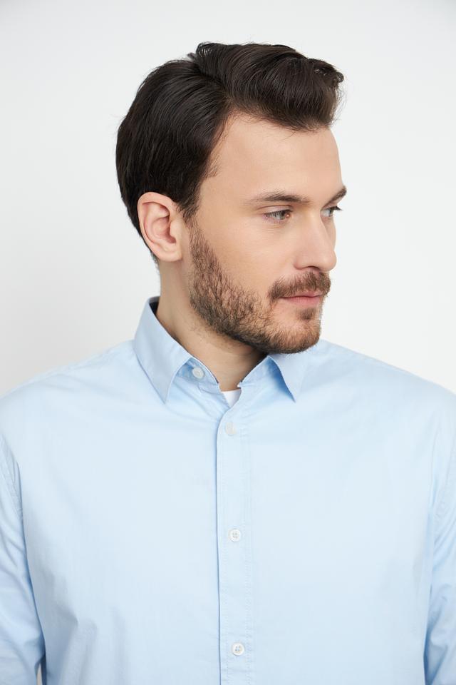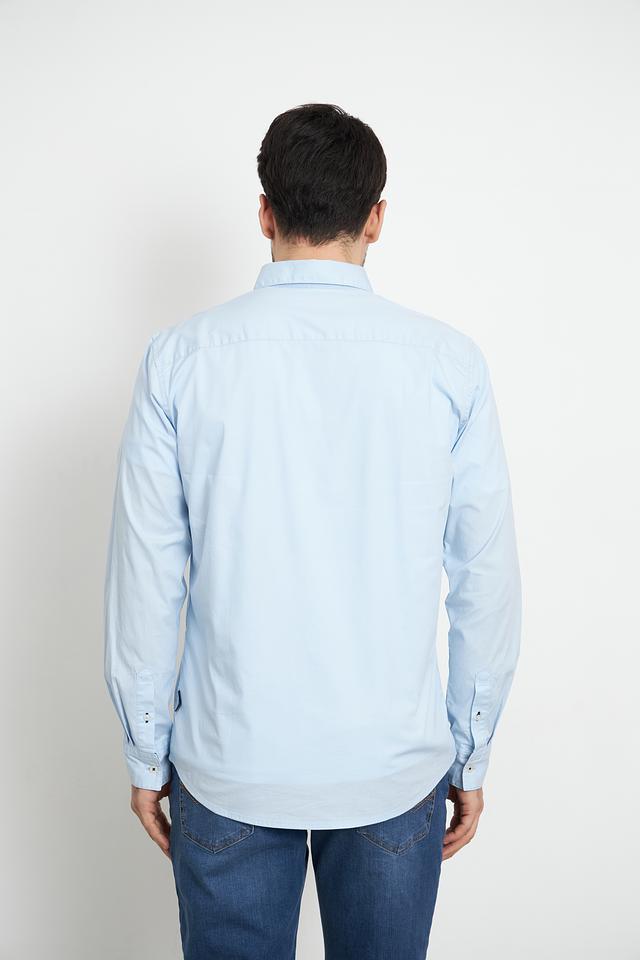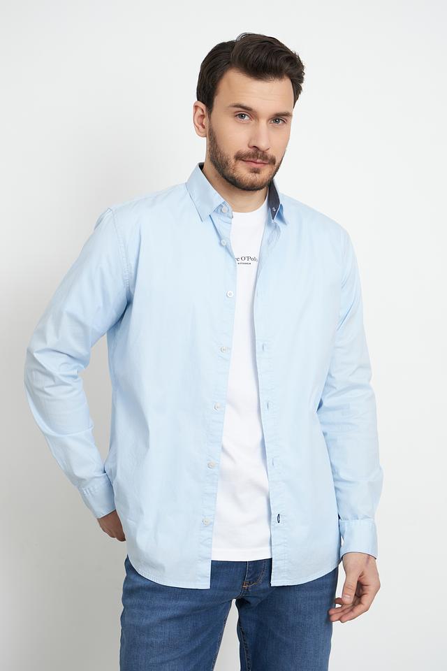Рубашка имеет классический крой с длинными рукавами и воротником на пуговицах. Изготовлена из качественного хлопка (98%) с добавлением эластана (2%), что обеспечивает комфорт при носке и сохранение формы.