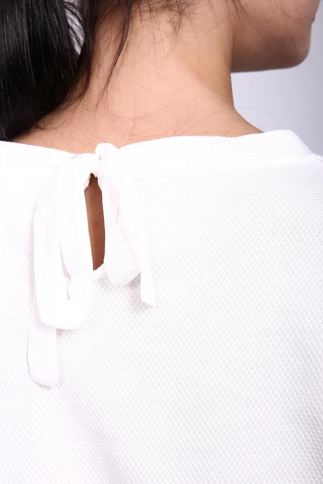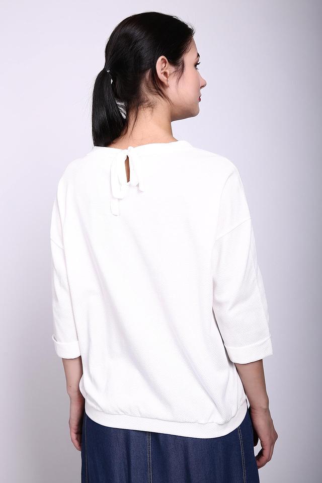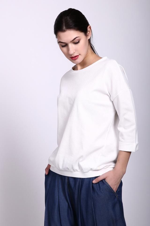 - Дизайн и крой: Свободный крой с рукавом три четверти и округлым вырезом горловины. Изюминкой модели является декоративный бант на спине, который придает блузе женственности и оригинальности.