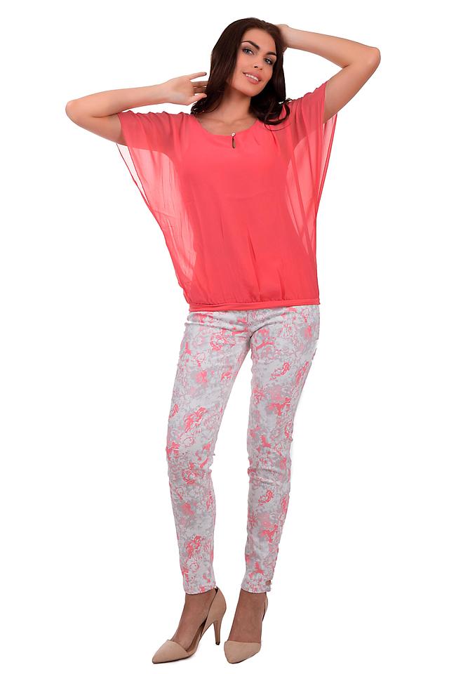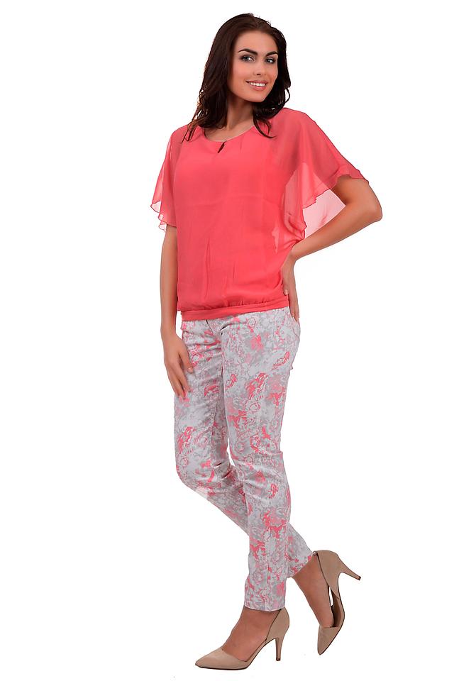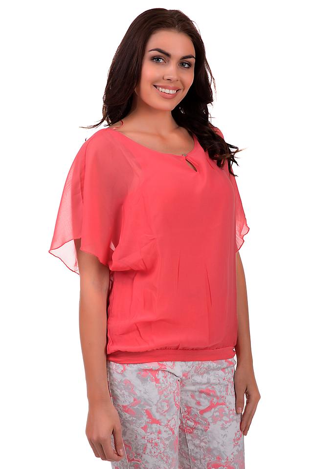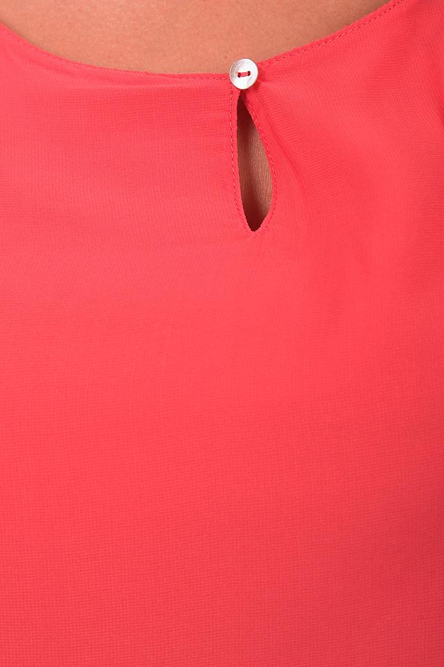 Блуза имеет свободный крой и короткие рукава-воланы, которые придают ей женственность и легкость. Коралловый цвет добавит яркости вашему образу. Вырез оформлен небольшой вертикальной декоративной деталью, подчеркивающей стильный дизайн.