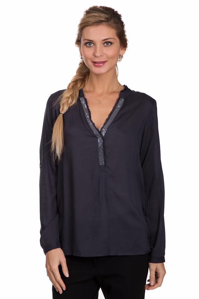 Стильная блуза Tom Tailor темно-синего цвета, украшенная пайетками в области горловины. Модель с длинными рукавами и V-образным вырезом станет отличным дополнением к вашему гардеробу. Состав: вискоза 100%