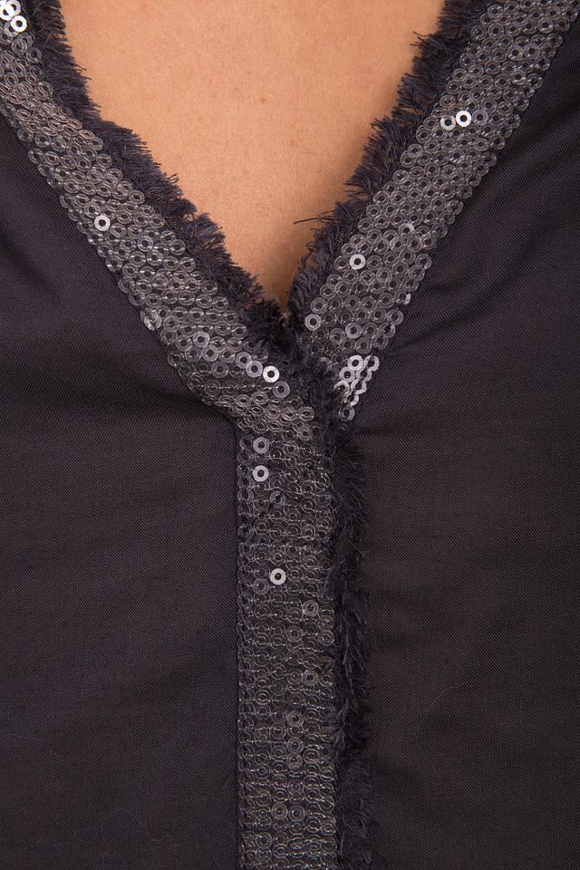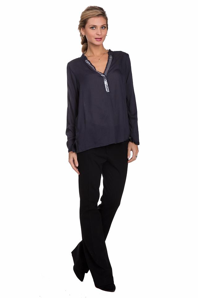 Блуза имеет длинные рукава и V-образный вырез горловины, который декорирован мерцающими пайетками. Декоративная отделка придает изделию изысканность и привлекает внимание.
