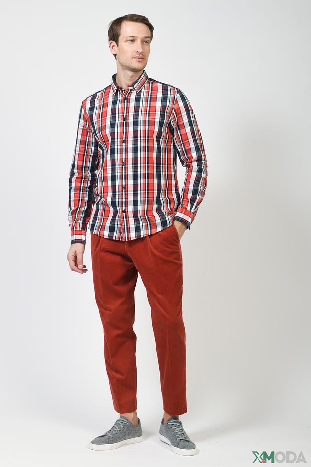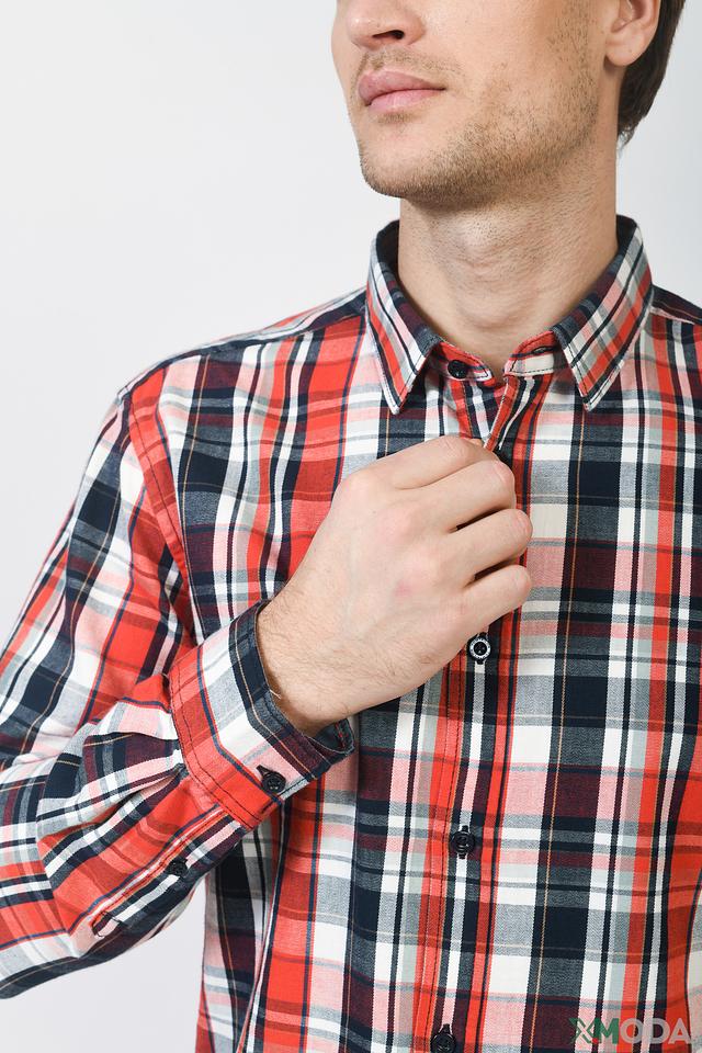 Рубашка имеет классический крой с длинными рукавами и отложным воротником. Её отличает яркий клетчатый рисунок в сочетании красного, синего и белого цветов, который придаёт ей стильный и современный вид.