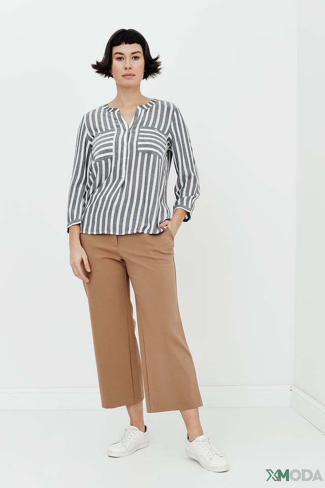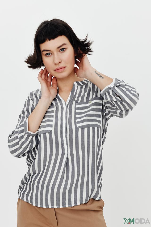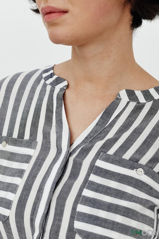 Блуза имеет классический крой с V-образным вырезом и короткими рукавами. Вертикальная полоска в серо-белой гамме визуально вытягивает силуэт и делает образ более динамичным.