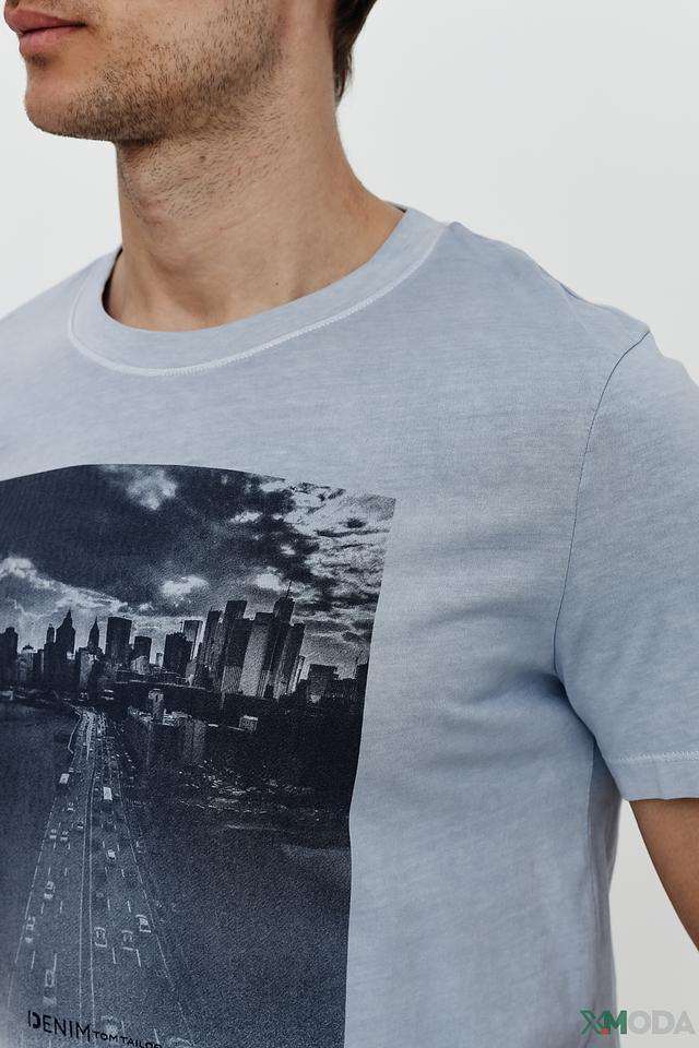 Мужская футболка Tom Tailor голубого цвета с ярким принтом в стиле denim. Изготовлена из 100% хлопка, обеспечивающего комфорт и воздухопроницаемость. Стильный и удобный выбор для повседневного образа. Состав: хлопок 100%