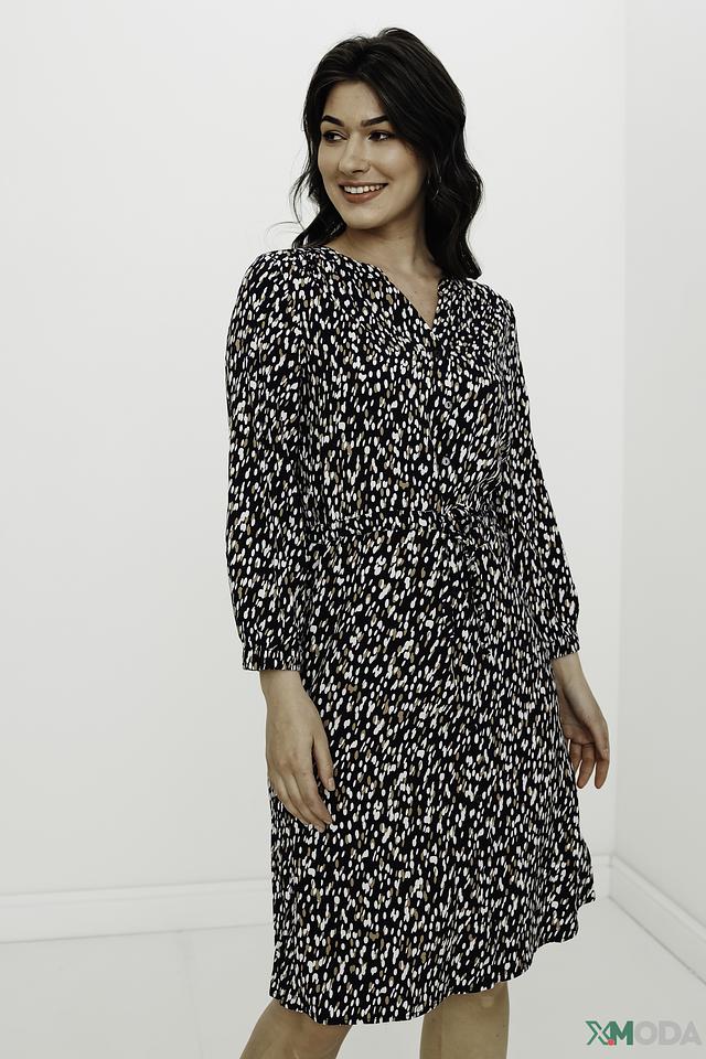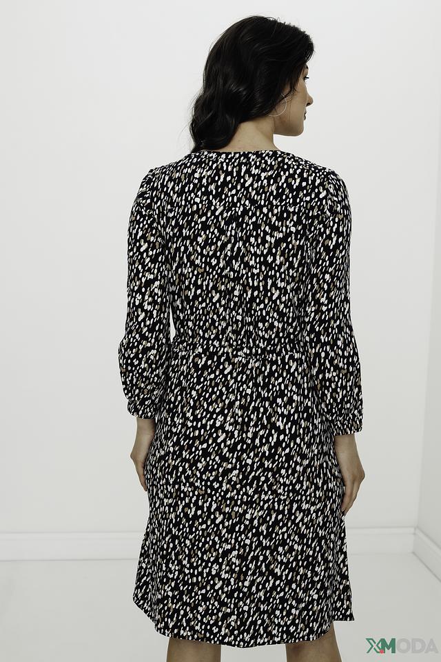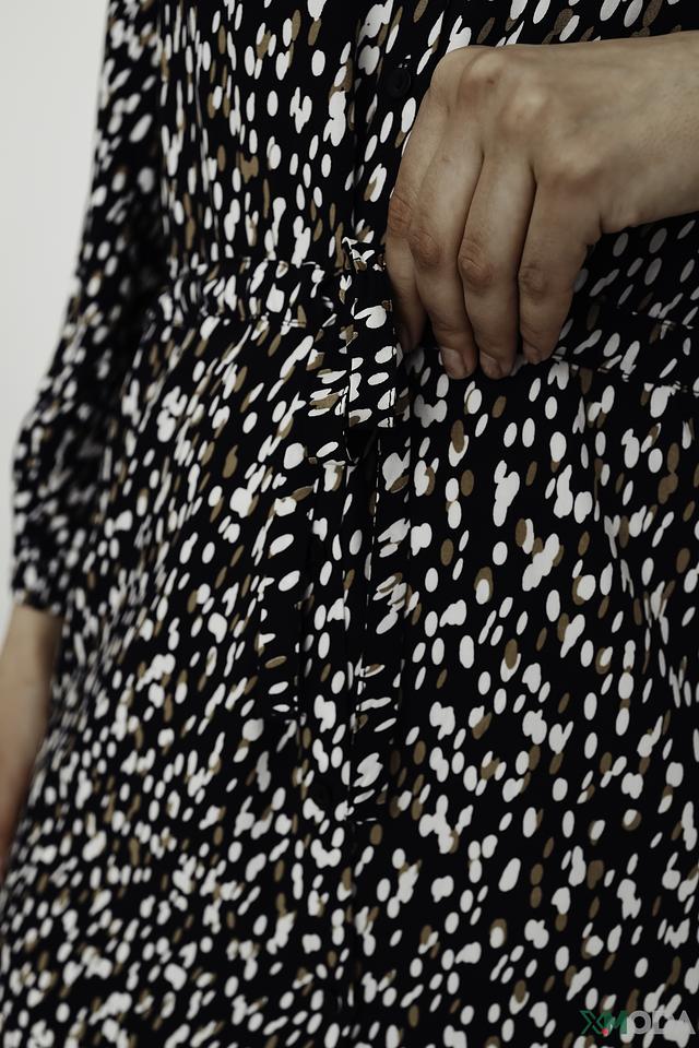 Чёрный цвет с оригинальным белым принтом делает это платье универсальным и легко сочетаемым с различными аксессуарами. Оно идеально подойдет для повседневной носки, работы или особых случаев.