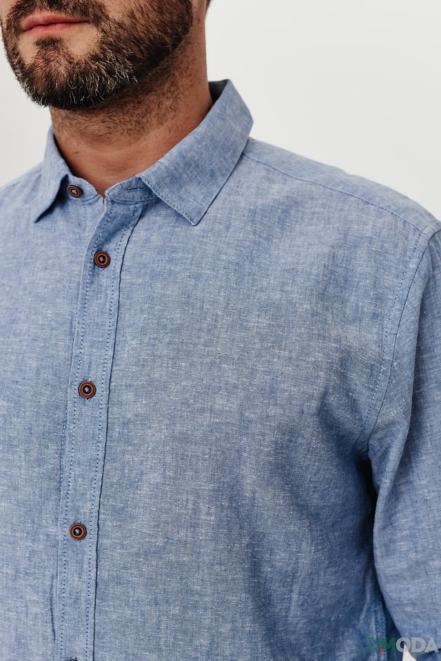 Рубашка имеет классический крой, воротник и застёжку на пуговицы. Голубой цвет и текстура льна придают ей лёгкий, непринуждённый вид. Идеально подходит для создания повседневных образов в тёплую погоду.