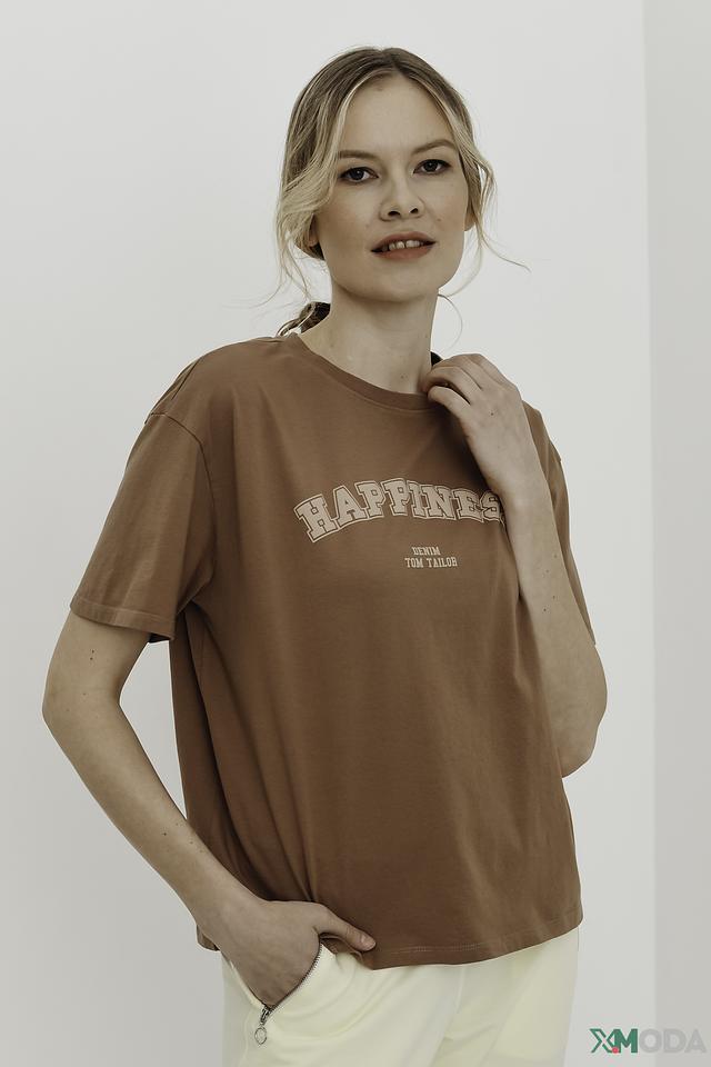 Женская футболка Tom Tailor denim коричневого цвета с надписью "HAPPINESS" — стильная и комфортная модель из 100% хлопка. Футболка имеет свободный крой и короткие рукава, идеально подходит для повседневной носки. Состав: хлопок 100%