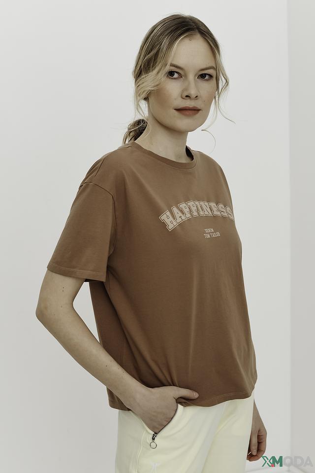 Особый акцент в дизайне – крупная надпись "HAPPINESS", выполненная в контрастном цвете. Это придает футболке стильный и современный вид. Цвет футболки – насыщенный коричневый, который легко сочетается с другими элементами одежды.