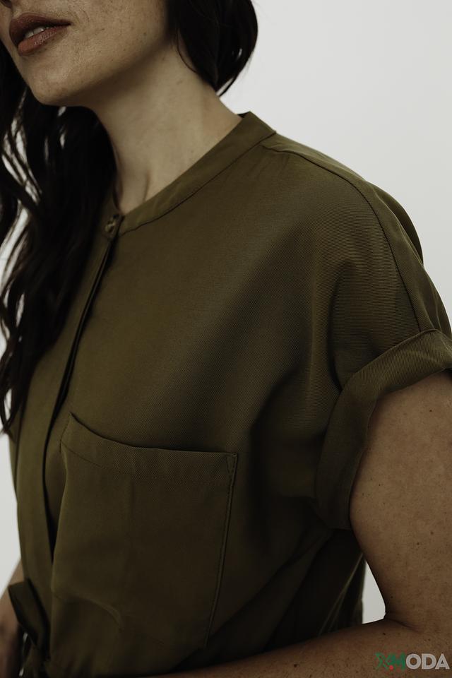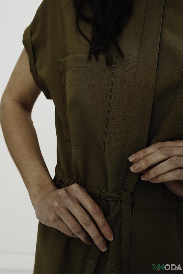 Платье имеет прямой крой, короткие рукава с манжетами и V-образный вырез. На передней части расположены накладные карманы, добавляющие практичности и стиля. Талию можно подчеркнуть с помощью притачного пояса с завязками.