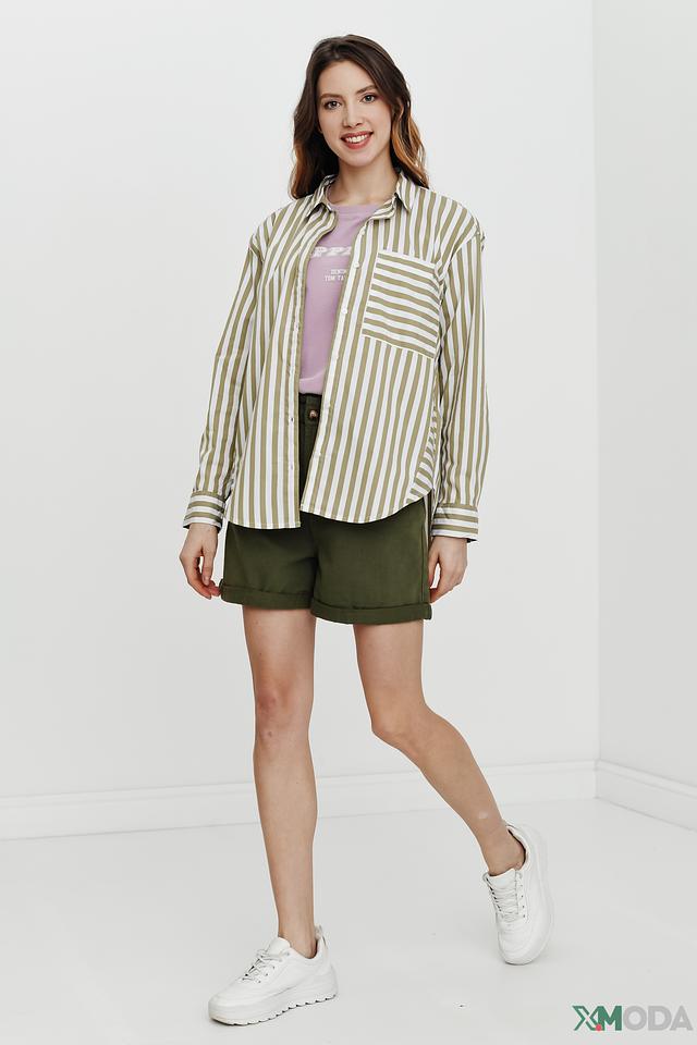 Основной цвет рубашки – сочетание зелёного и белого в вертикальную полоску. На груди расположена накладная деталь в полоску, добавляющая оригинальности дизайну. Рубашка застегивается на пуговицы.