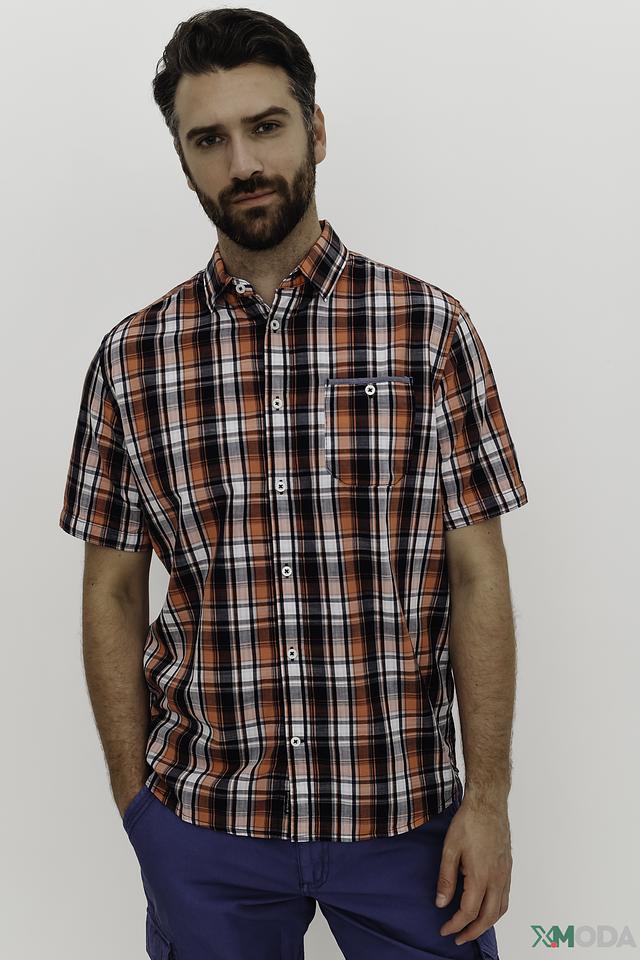 Рубашка выполнена в классическом крое с короткими рукавами и традиционным воротником. Яркий клетчатый принт в оранжево-бело-черной гамме делает эту модель заметной и привлекательной. На груди расположена накладная кармашка с пуговицей.