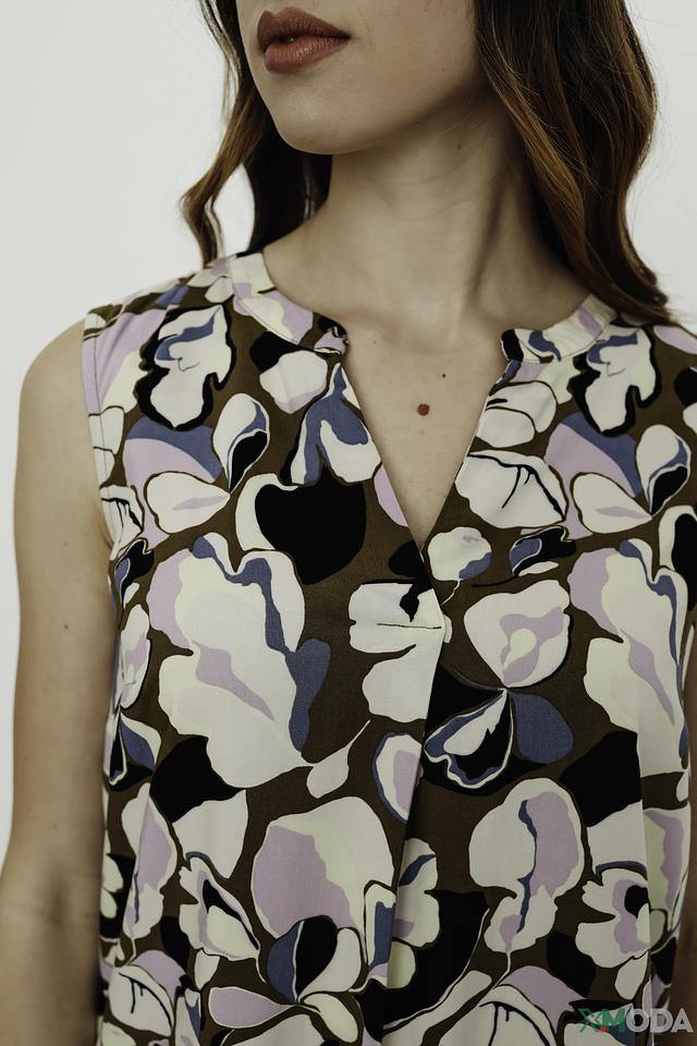 V-образный вырез подчеркивает линию шеи и декольте, а отсутствие рукавов делает модель идеальной для теплой погоды. Яркий цветочный принт добавляет образу женственности и оригинальности.
