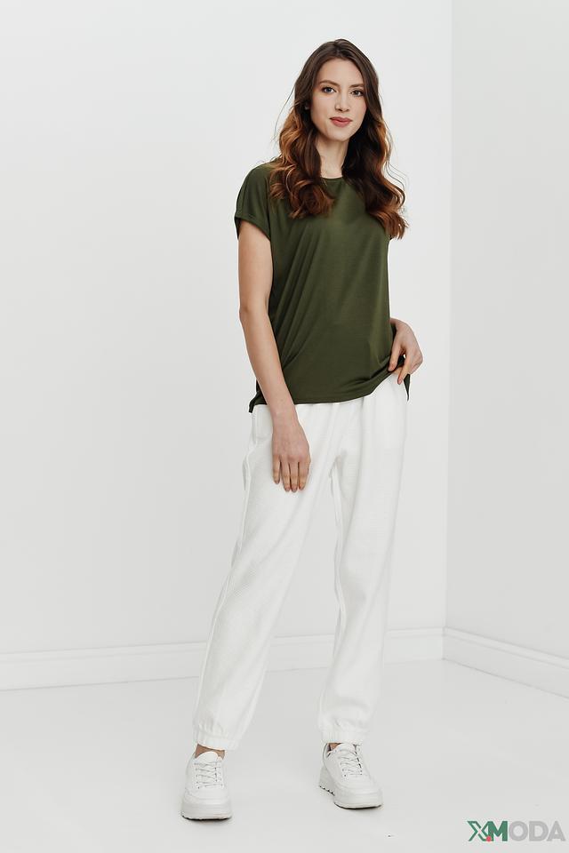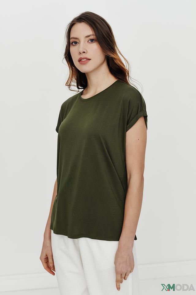 Модель имеет прямой крой и круглый вырез горловины. Короткие рукава-крылышки добавляют образу лёгкости и непринуждённости. Футболка изготовлена из высококачественной вискозы (73%) и полиэстера (27%), что обеспечивает мягкость, комфорт и хорошую посадку по фигуре.