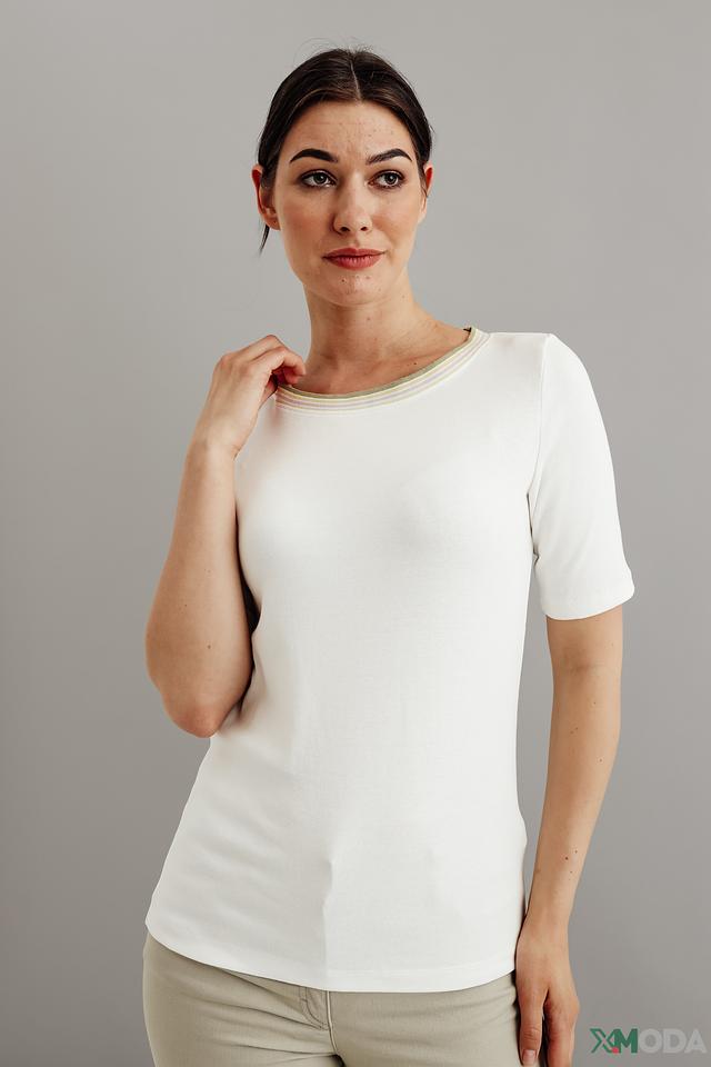 Особенностью данной модели является декоративная полоска у горловины, выполненная в нежных пастельных тонах. Она добавляет образу легкости и свежести.