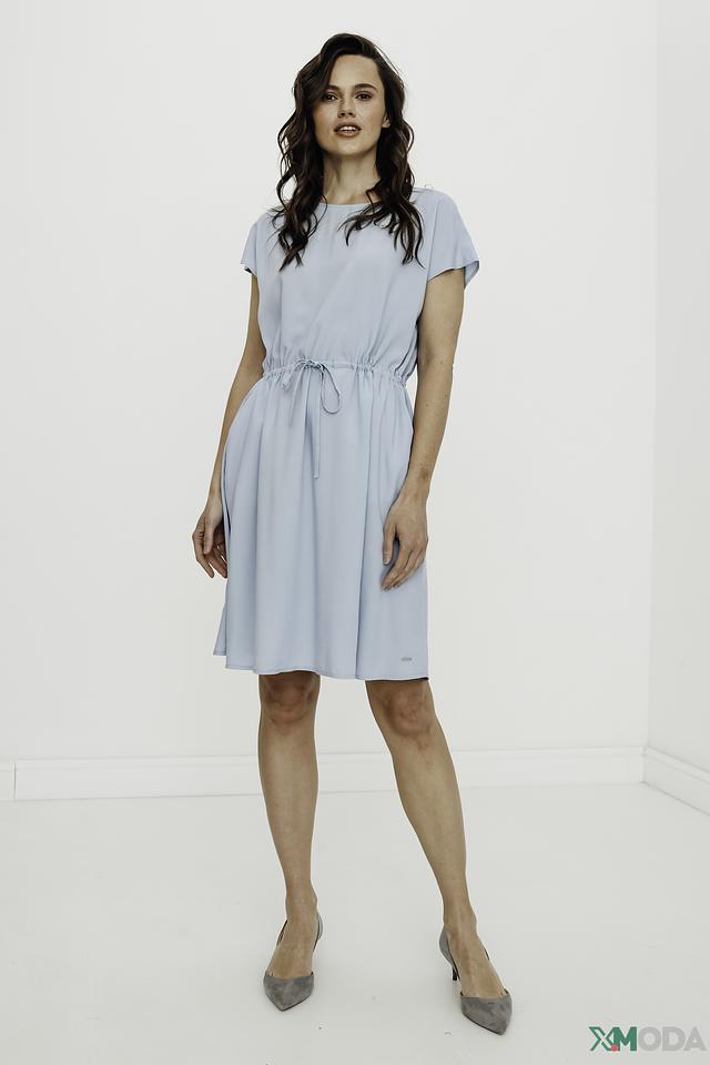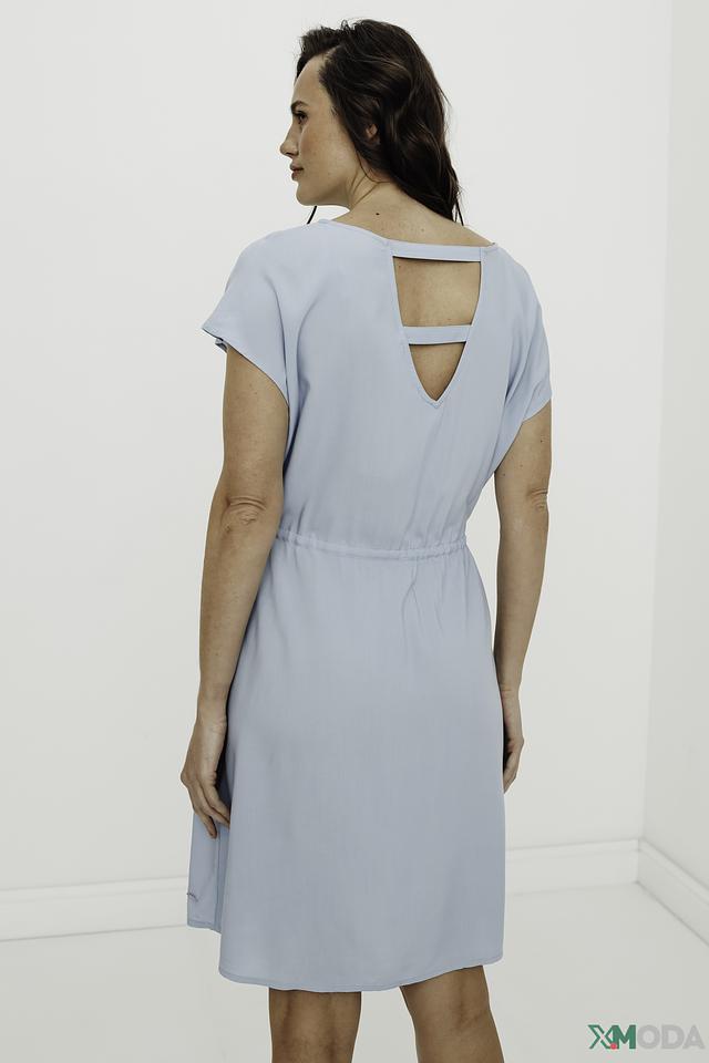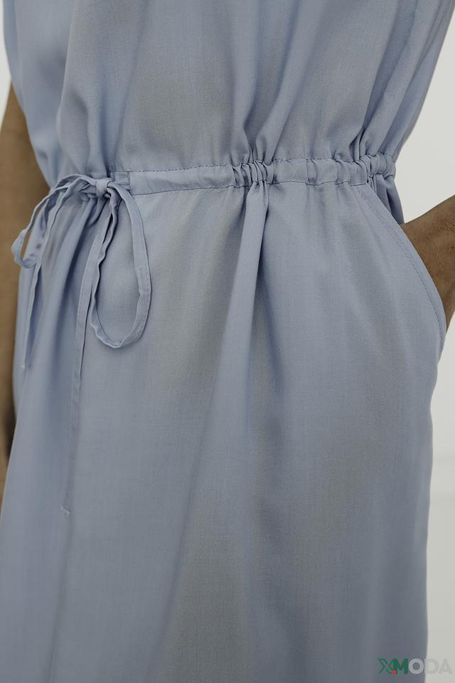 Особенностью этого платья является его нежный голубой цвет и минималистичный дизайн. Короткие рукава и V-образный вырез на спине добавляют образу легкости и женственности. Пояс позволяет подчеркнуть талию и создать более приталенный силуэт.