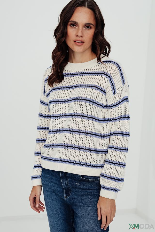 Женский пуловер Tom Tailor denim girl белого и синего цвета, выполнен в горизонтальную полоску. Модель имеет круглый вырез горловины и свободный крой, идеально подходит для создания повседневных образов. Состав: хлопок 100%