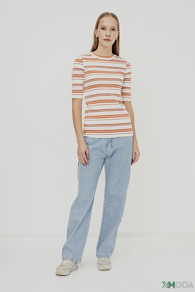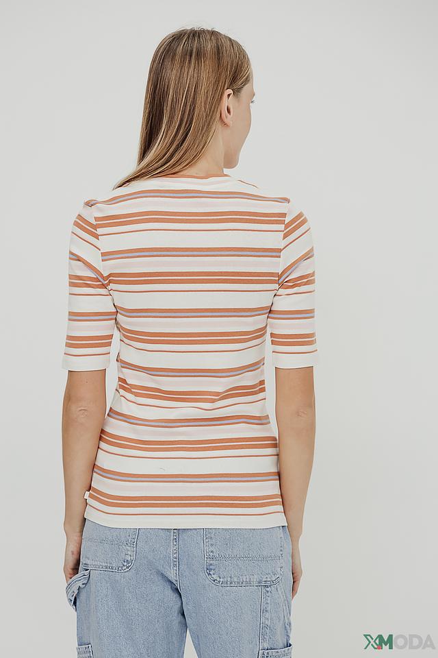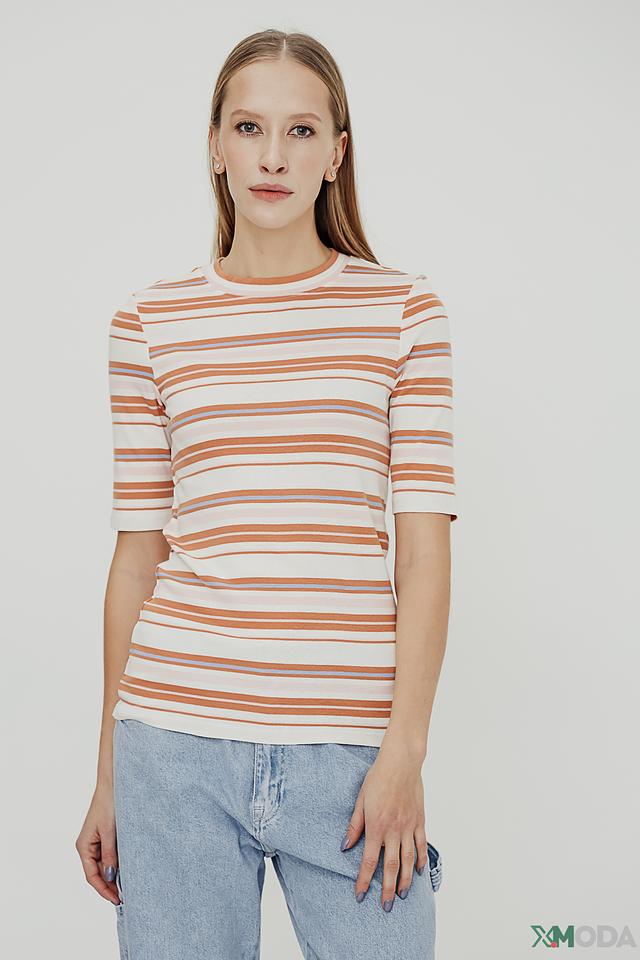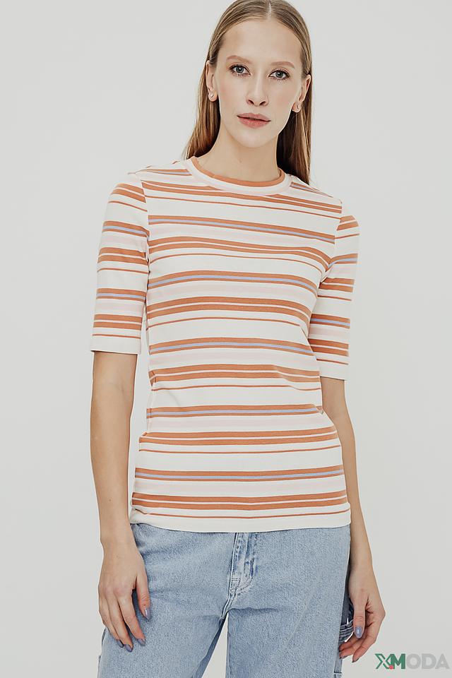 Женская футболка Tom Tailor бежево-коричневого цвета в горизонтальную полоску. Модель выполнена из мягкого хлопка с добавлением эластана, что обеспечивает комфорт и хорошую посадку по фигуре. Футболка с короткими рукавами и круглым вырезом горловины. Состав: хлопок 97%, эластан 3%