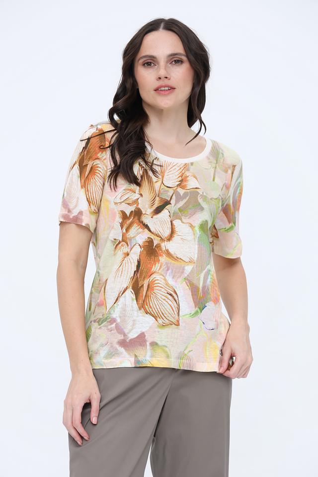 Женская футболка Toni collection бежевого цвета с ярким цветочным принтом. Изготовлена из 100% льна, что обеспечивает комфорт и воздухопроницаемость в жаркую погоду. Стильный и лёгкий вариант для создания повседневного образа. Состав: лен 100%