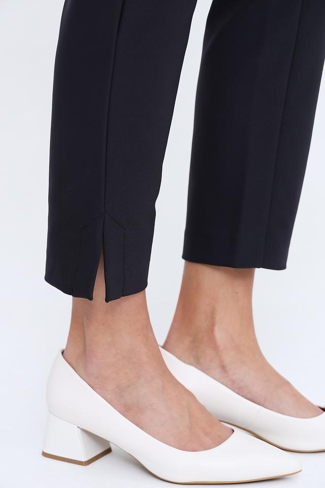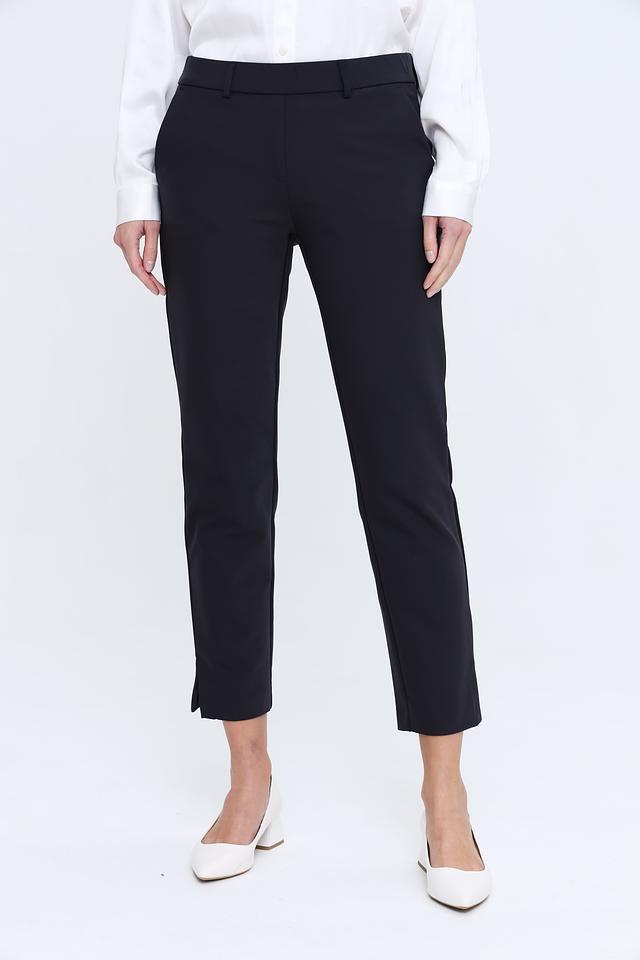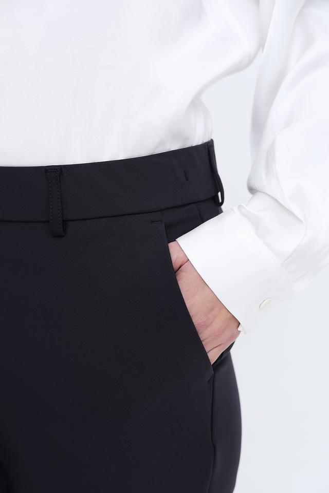 Цвет брюк — насыщенный чёрный. Модель отличается минималистичным дизайном без лишних деталей, что делает её универсальной и подходящей для сочетания с различными видами верха. Брюки имеют стандартную длину и подойдут для ношения с туфлями или ботинками.