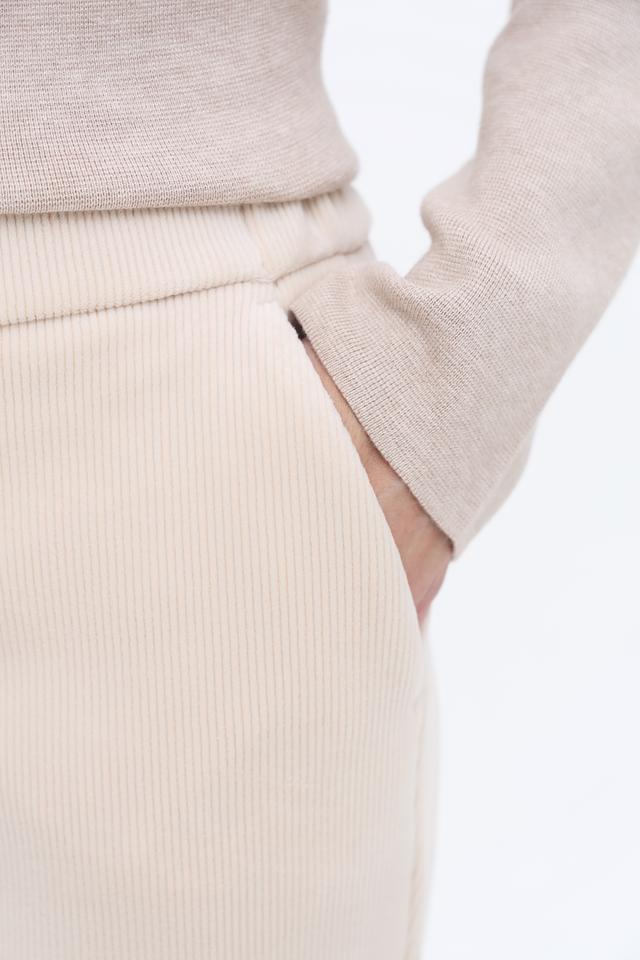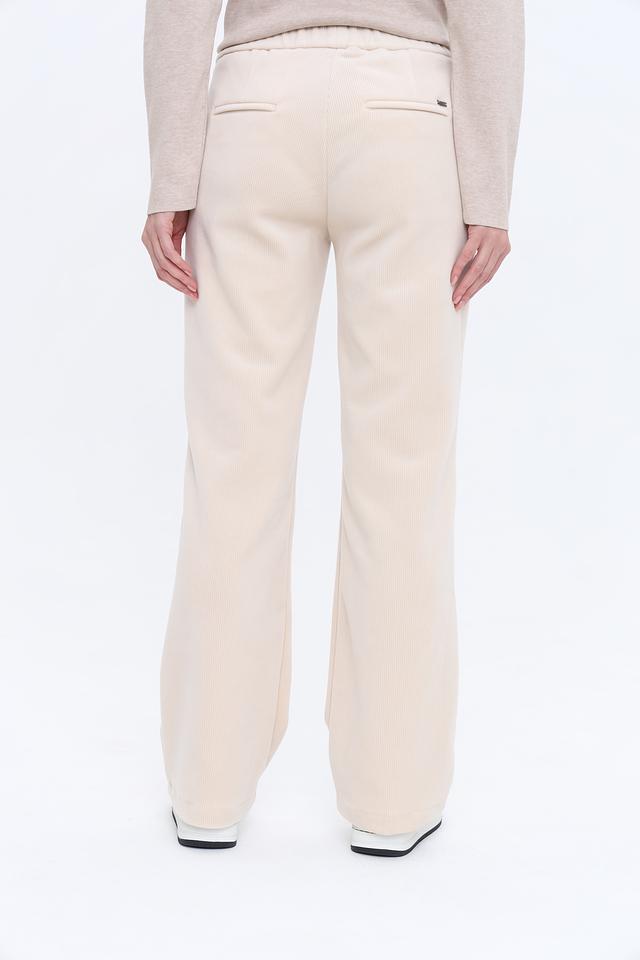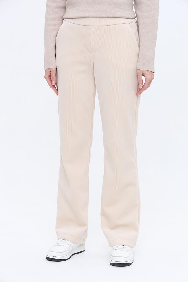 Брюки имеют прямой крой и эластичный пояс, обеспечивающий удобную посадку по фигуре. Ткань состоит из полиэстера (95%) и эластана (5%), что гарантирует приятные тактильные ощущения, износостойкость и небольшую эластичность.