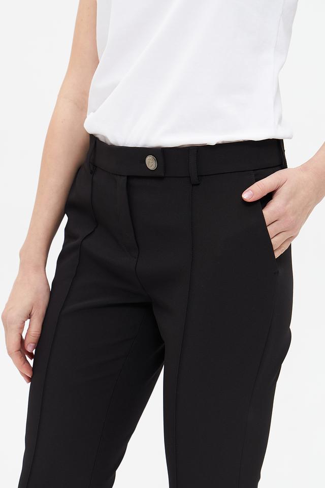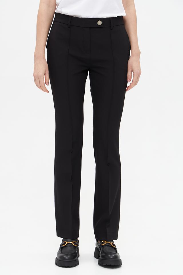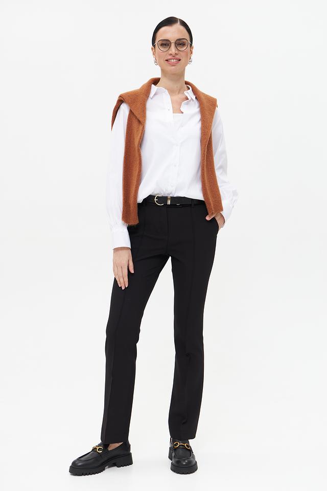 Изготовленные из полиэстера с добавлением эластана, брюки приятны на ощупь, хорошо держат форму и практически не мнутся. Эластан обеспечивает свободу движений и комфорт в носке. Данная модель идеально подойдет для создания деловых и повседневных образов.