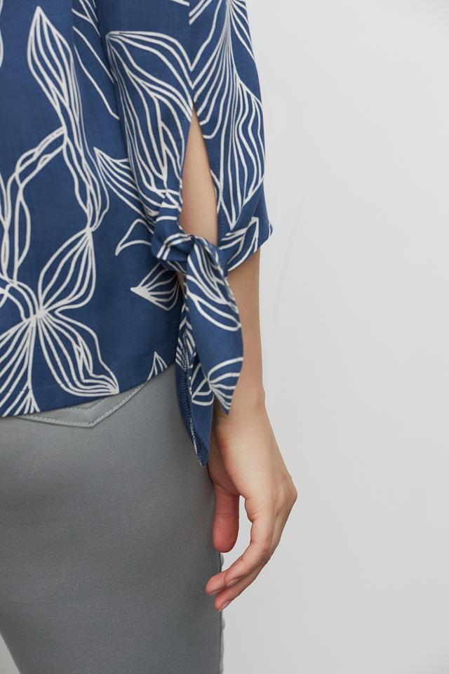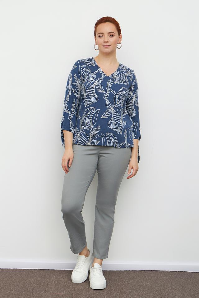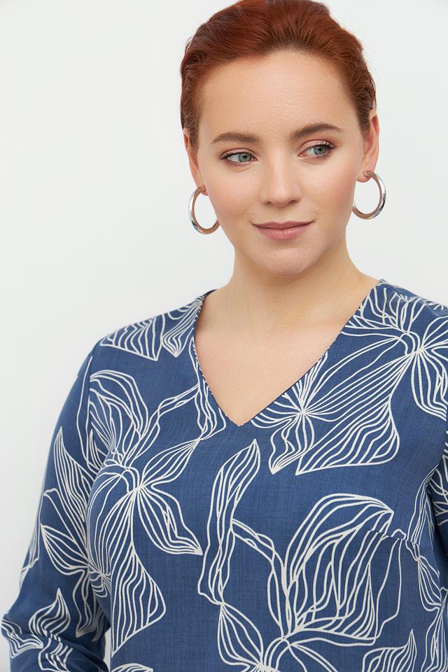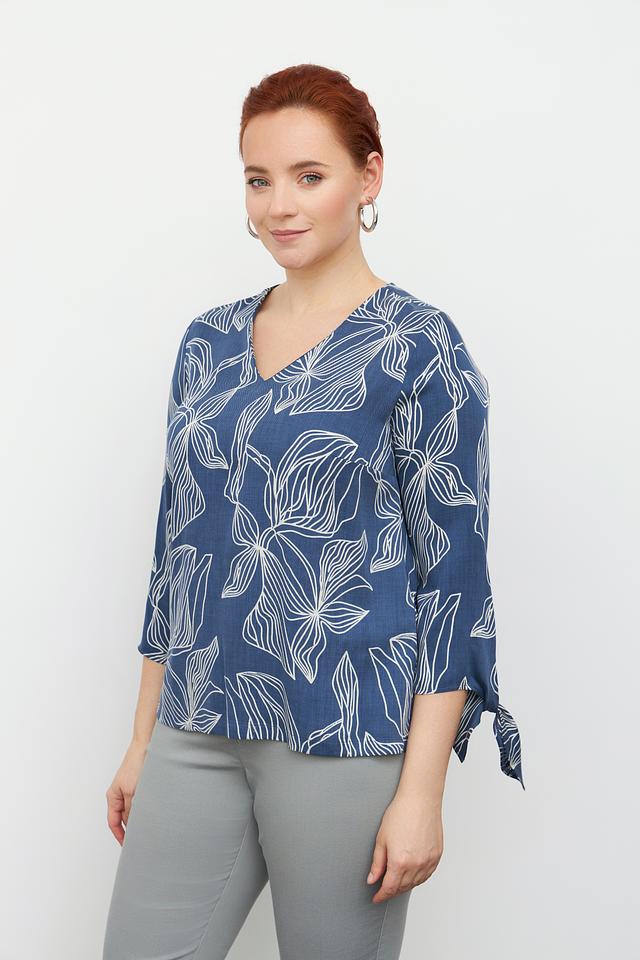 Эта стильная блузка от Toni collection выполнена в приятном синем цвете и украшена изысканным белым цветочным принтом. Модель имеет V-образный вырез горловины и короткие рукава 3/4, которые дополнены аккуратными завязками по бокам.